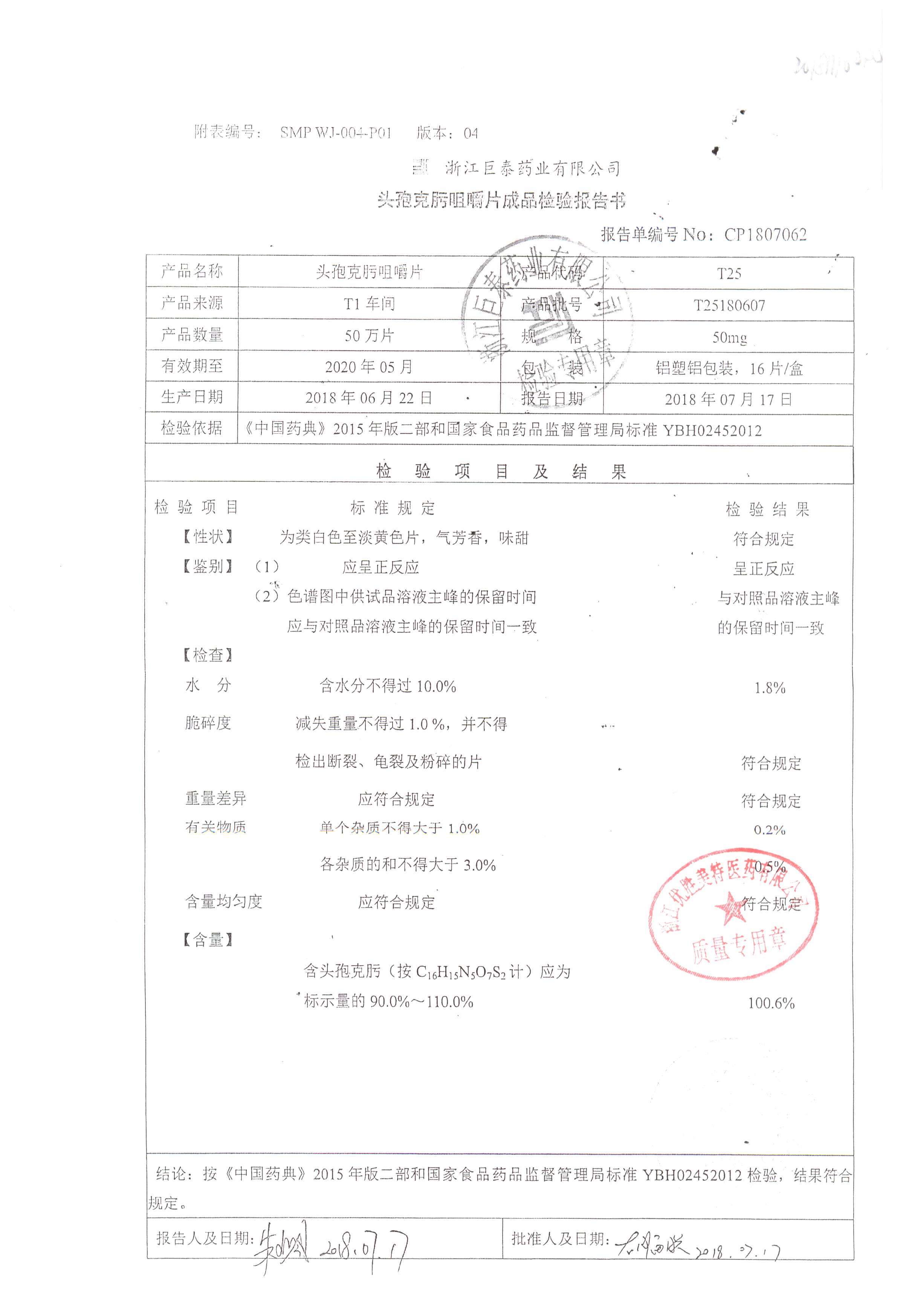 | 頭孢克肟咀嚼片 | 50mg*16s | T25180501 | 查看詳情 |