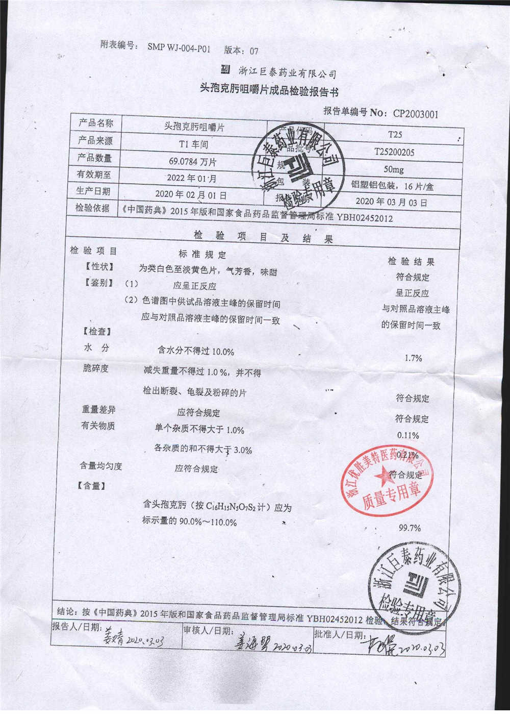| 頭孢克肟咀嚼片 | 50mg*16s | T25201114 | 查看詳情 |