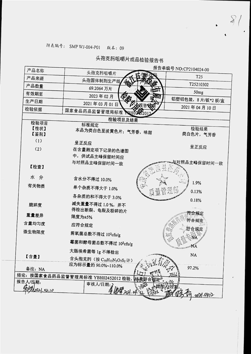| 頭孢克肟咀嚼片 | 50mg*16s | T25210203 | 查看詳情 |