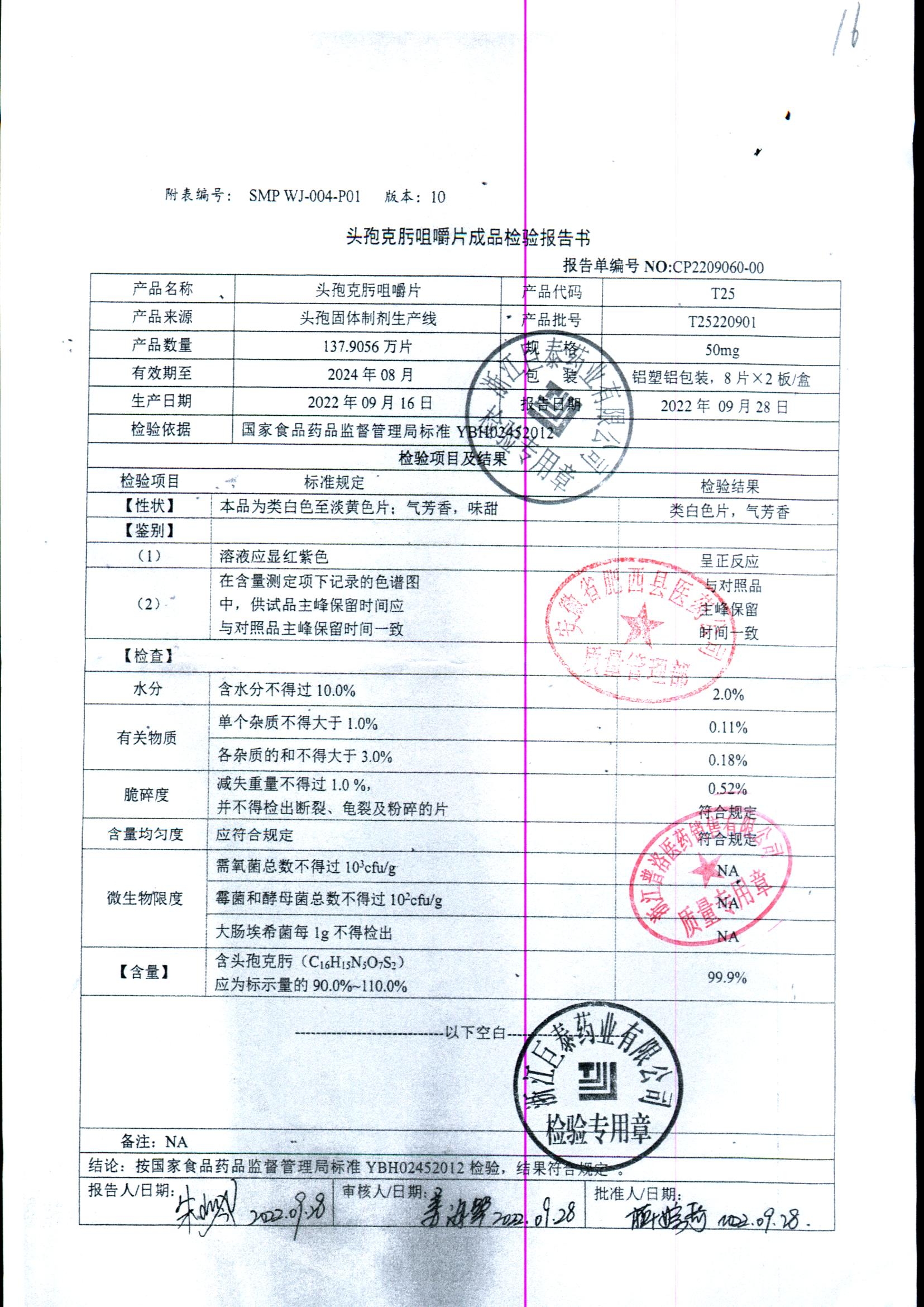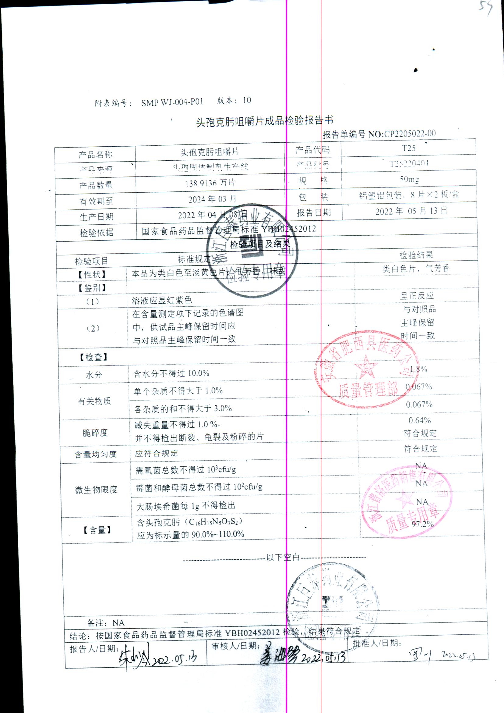 | 頭孢克肟咀嚼片 | 50mg*16s | T25220901 | 查看詳情 |