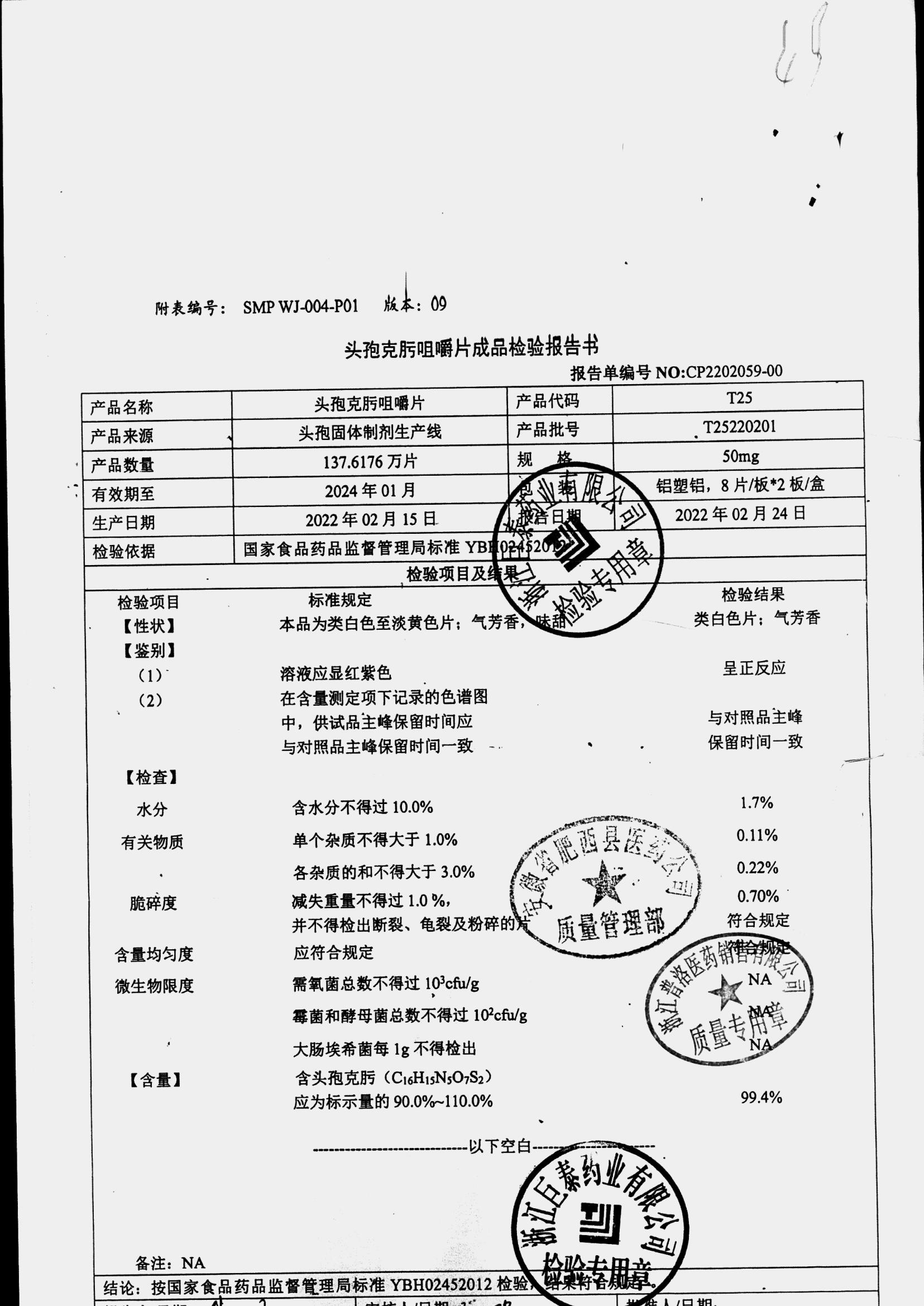| 頭孢克肟咀嚼片 | 50mg*16s | T25220201/2 | 查看詳情 |