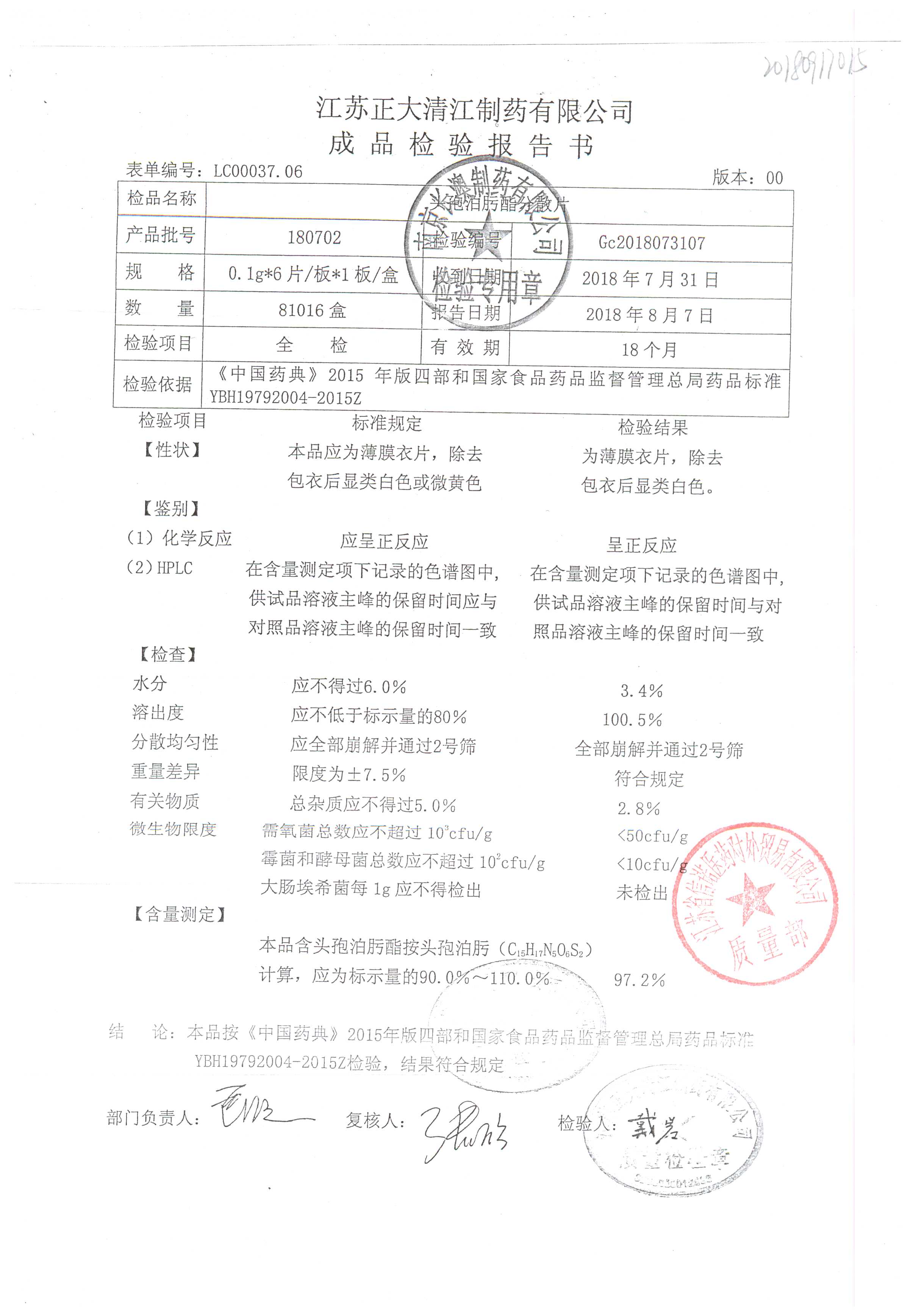 | 頭孢泊肟酯分散片 | 0.1g*6s | 180901 | 查看詳情 |