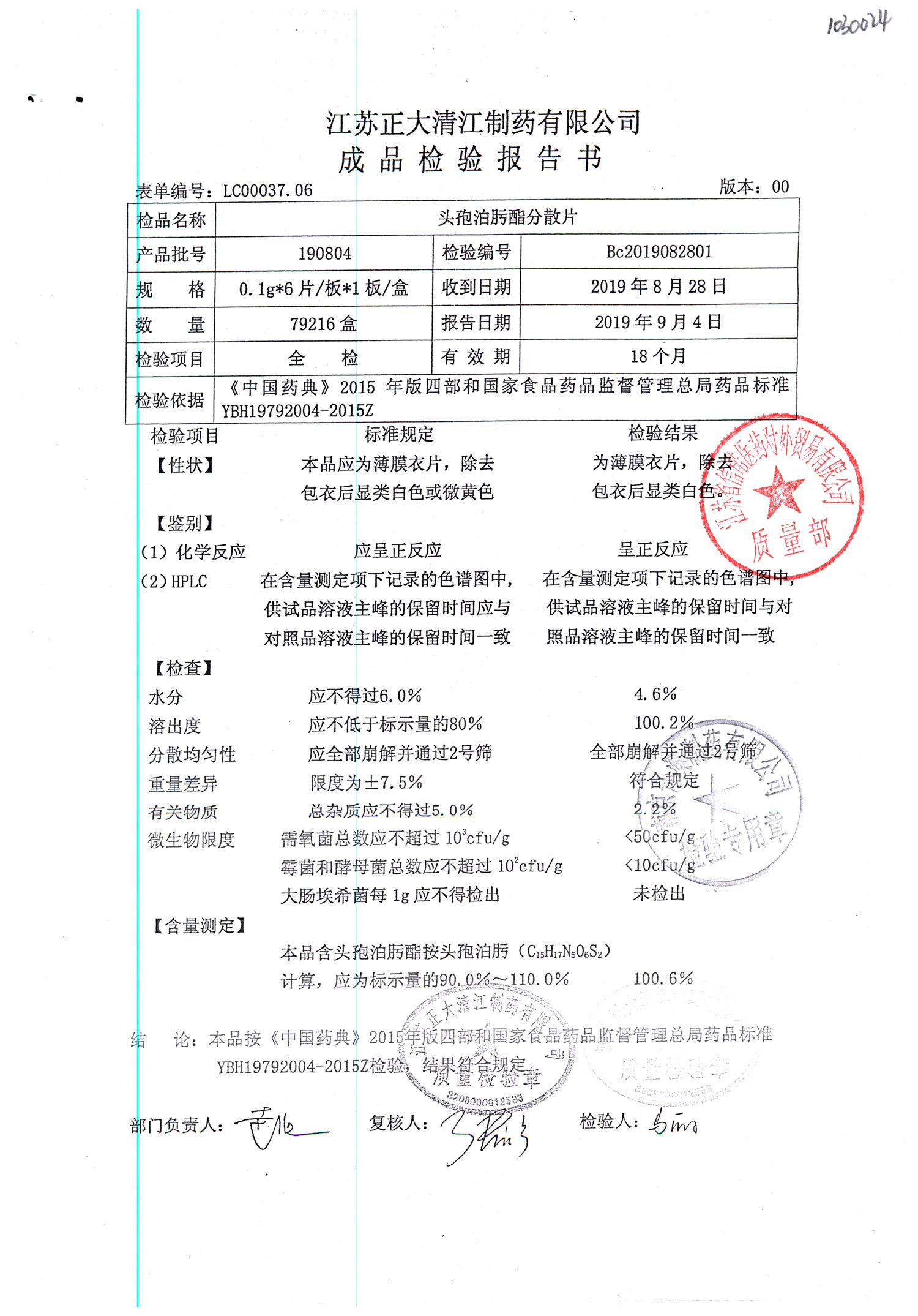 | 頭孢泊肟酯分散片 | 0.1g*6s | 190804 | 查看詳情 |