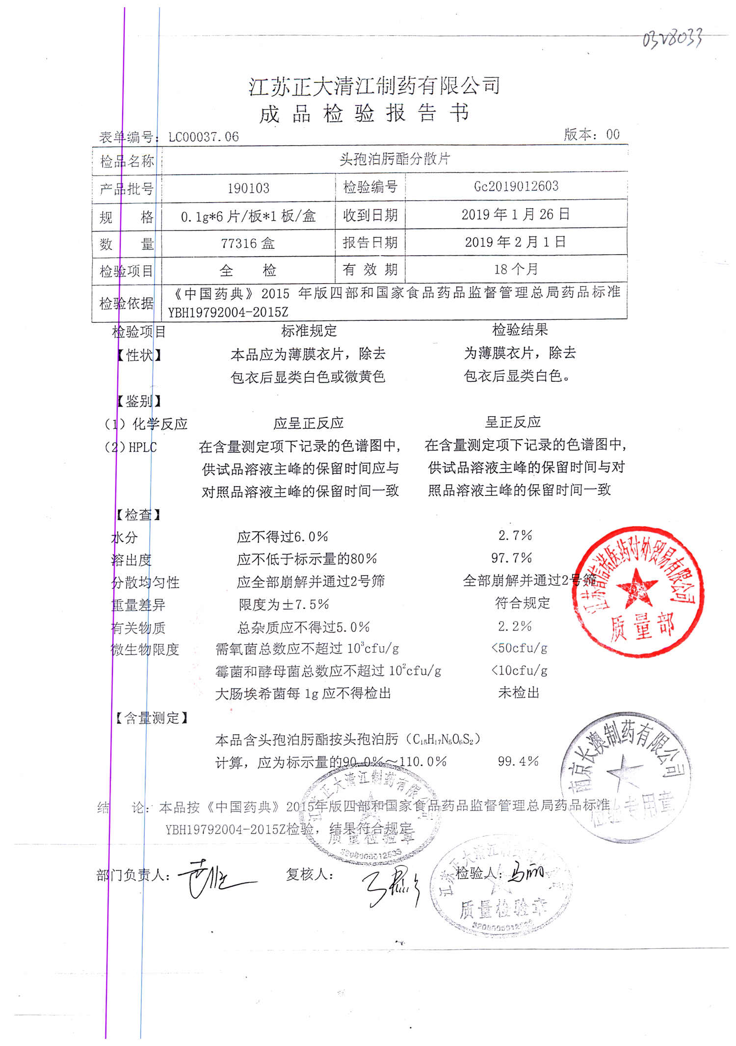 | 頭孢泊肟酯分散片 | 0.1g*6s | 190803 | 查看詳情 |