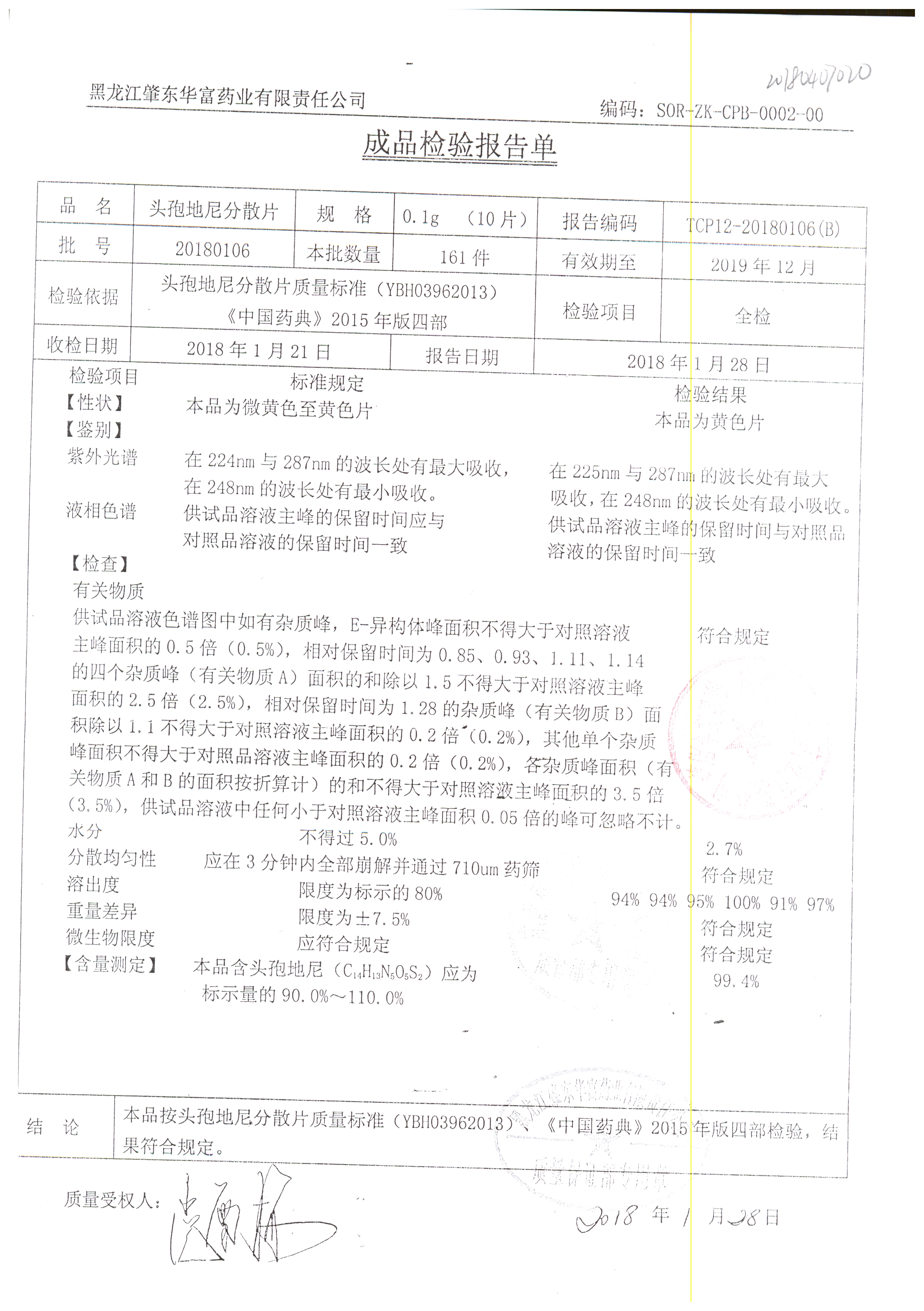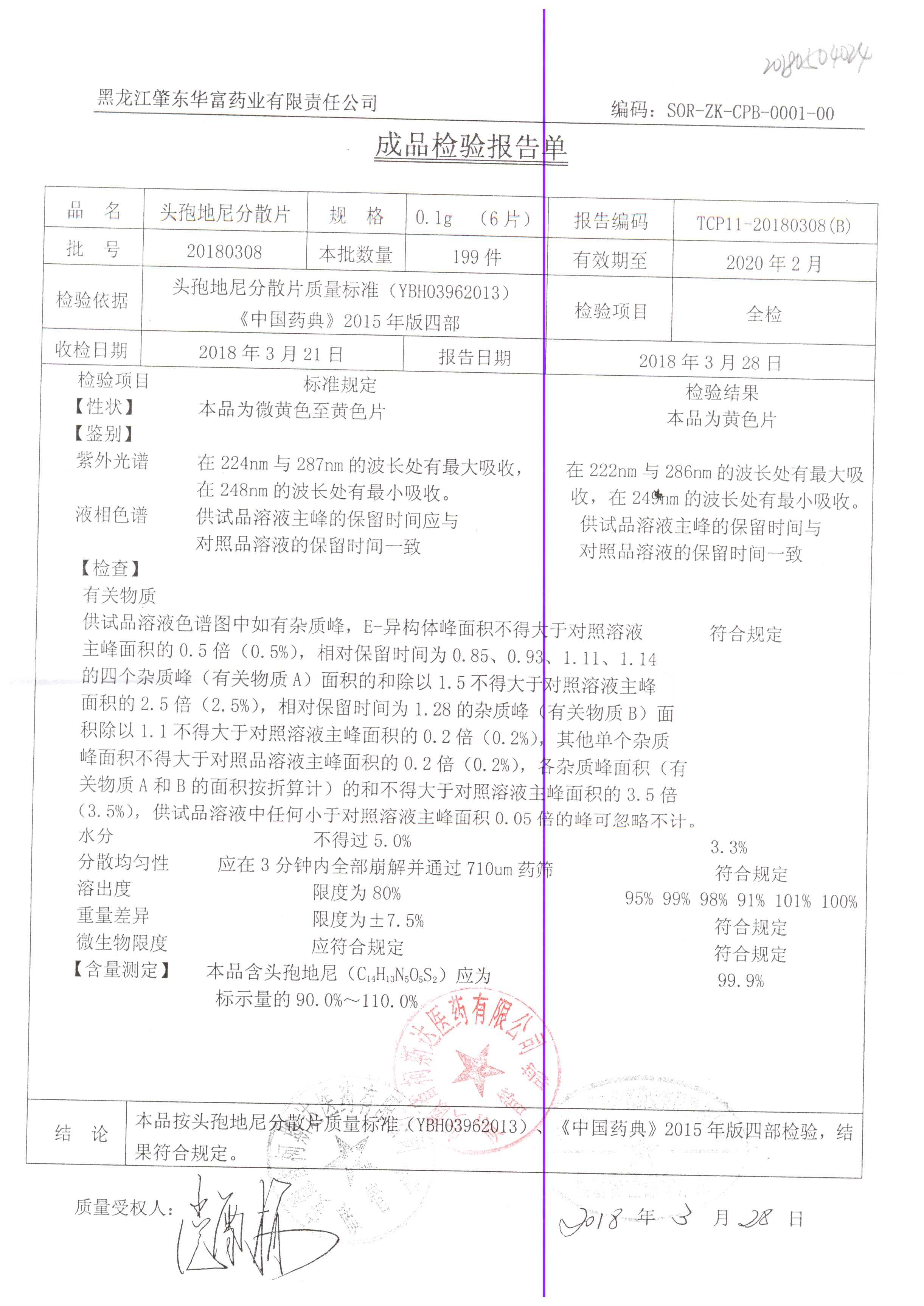 頭孢地尼分散片 0.1g*10s 20180308 查看詳情