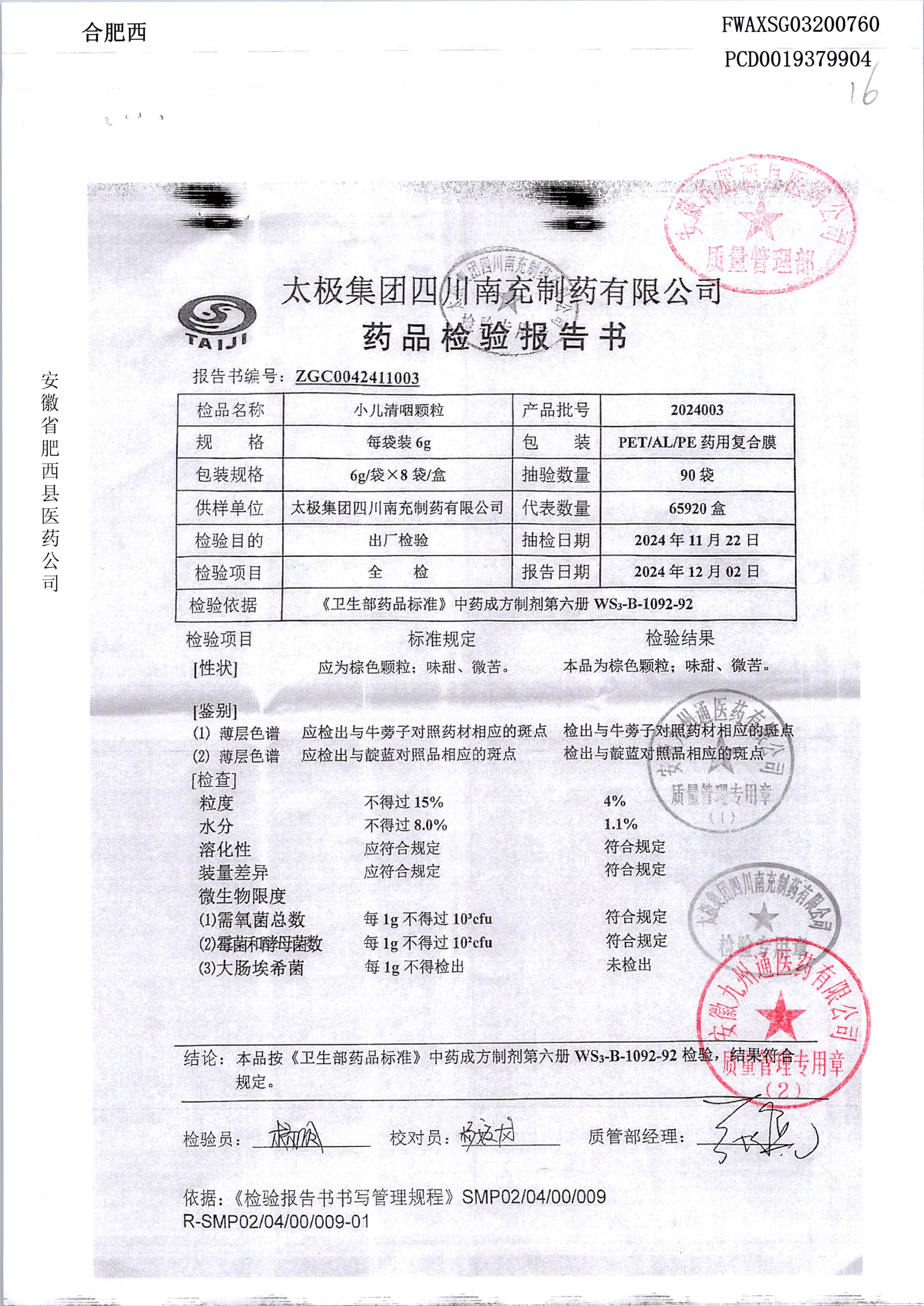 名稱 規格 批號 藥檢報告