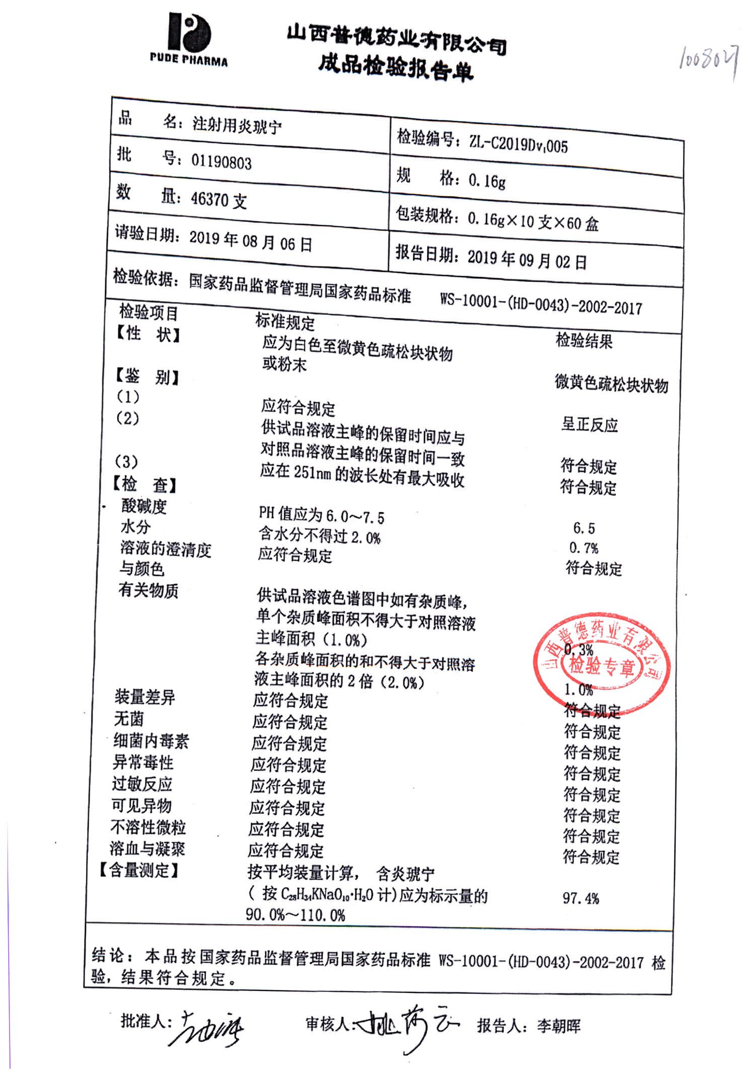 | 注射用炎琥寧 | 0.16g*10支 | 01190808 | 查看詳情 |