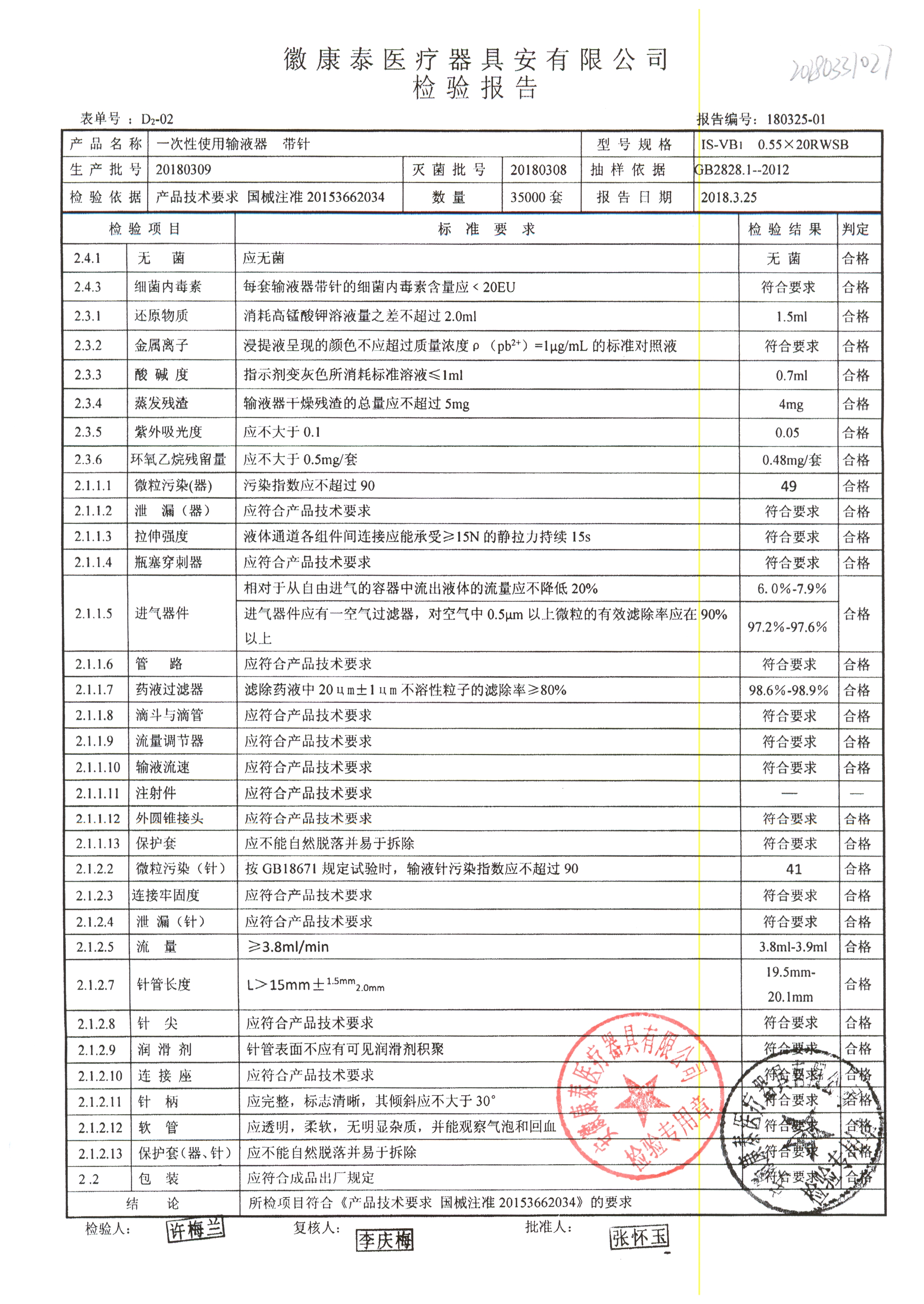 | 一次性使用輸液器 帶針 | 0.55*20RWSB | 20200326 | 查看詳情 |