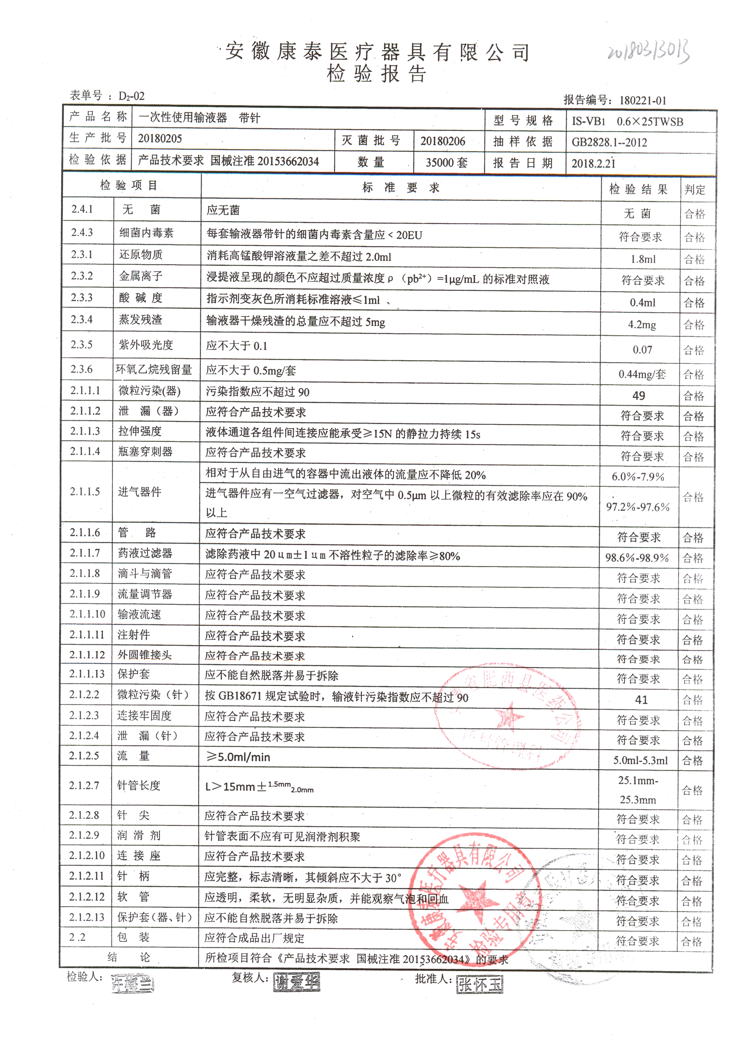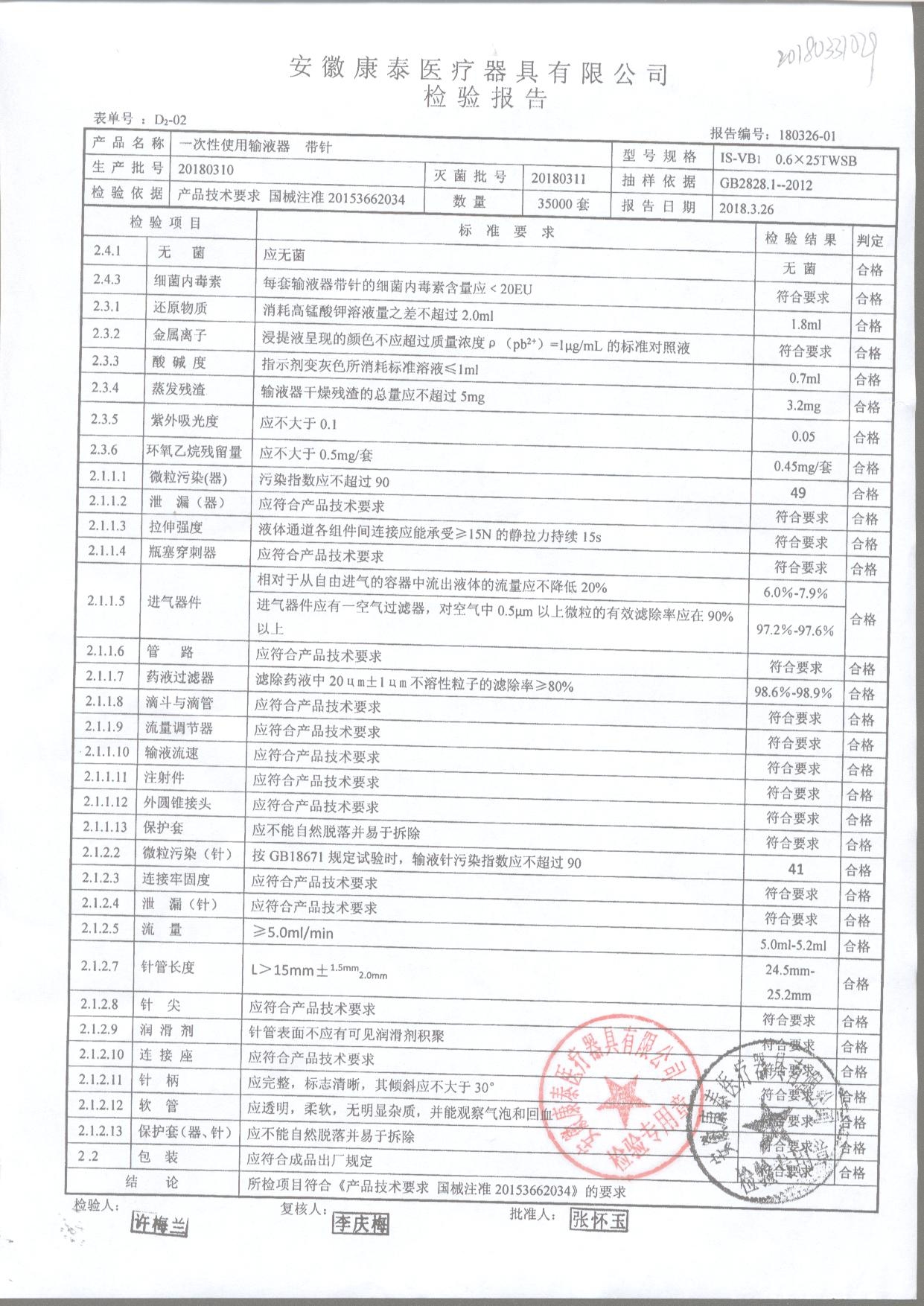 | 一次性使用輸液器 帶針 | 0.6*25TWSB | 20180206 | 查看詳情 |