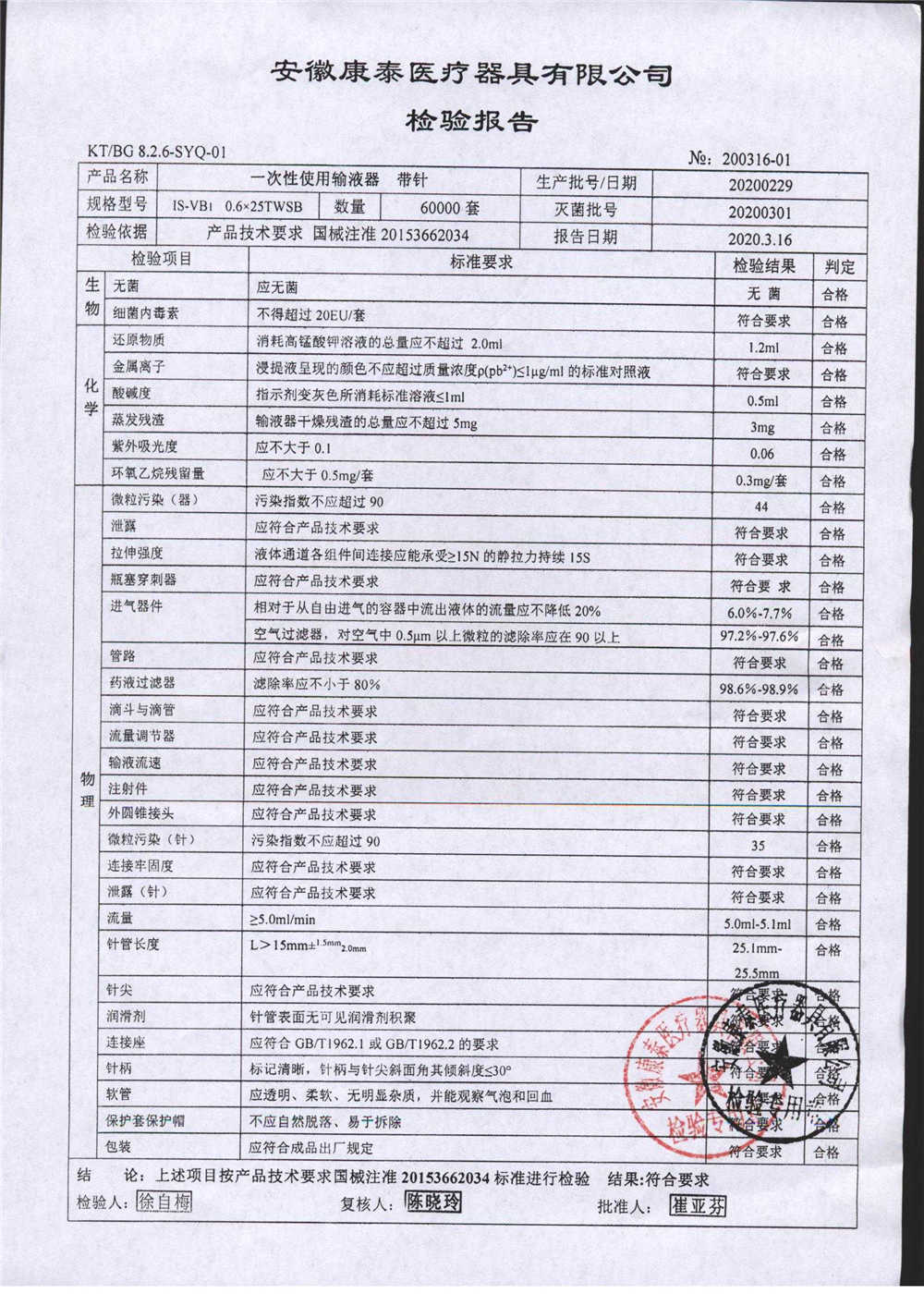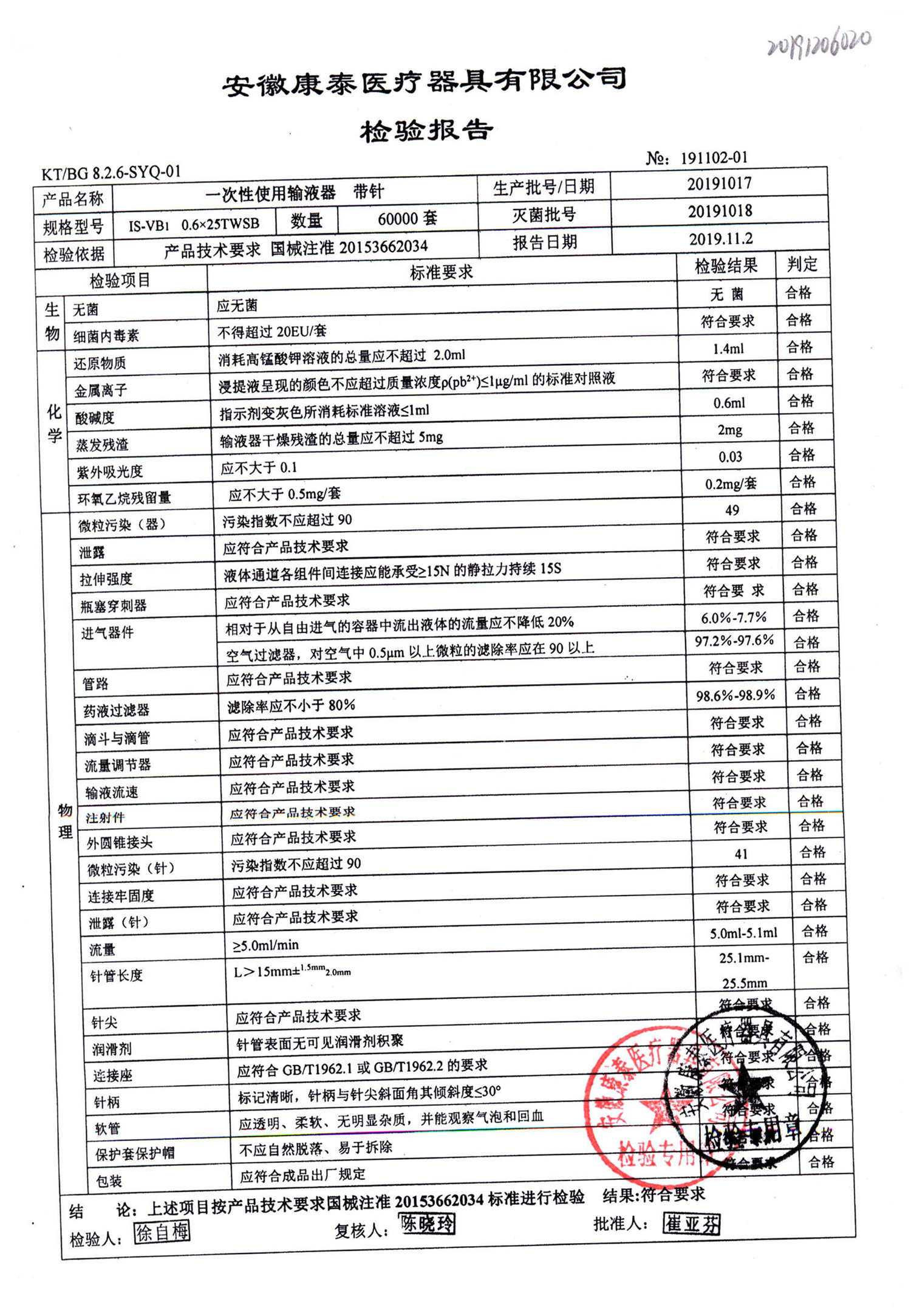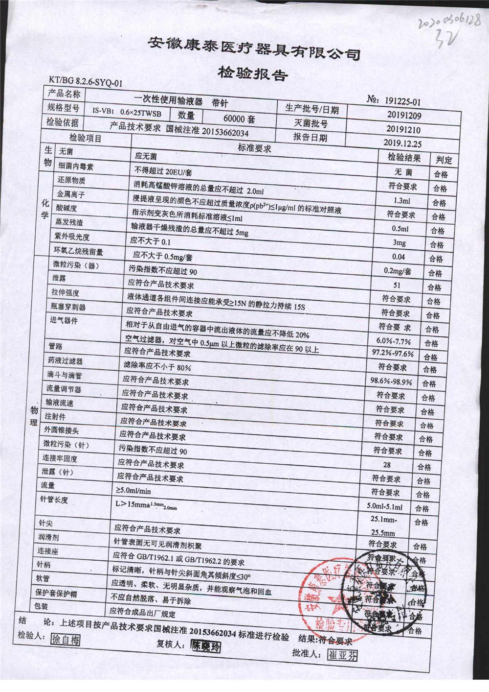 | 一次性使用輸液器 帶針 | 0.6*25TWSB | 20200229 | 查看詳情 |