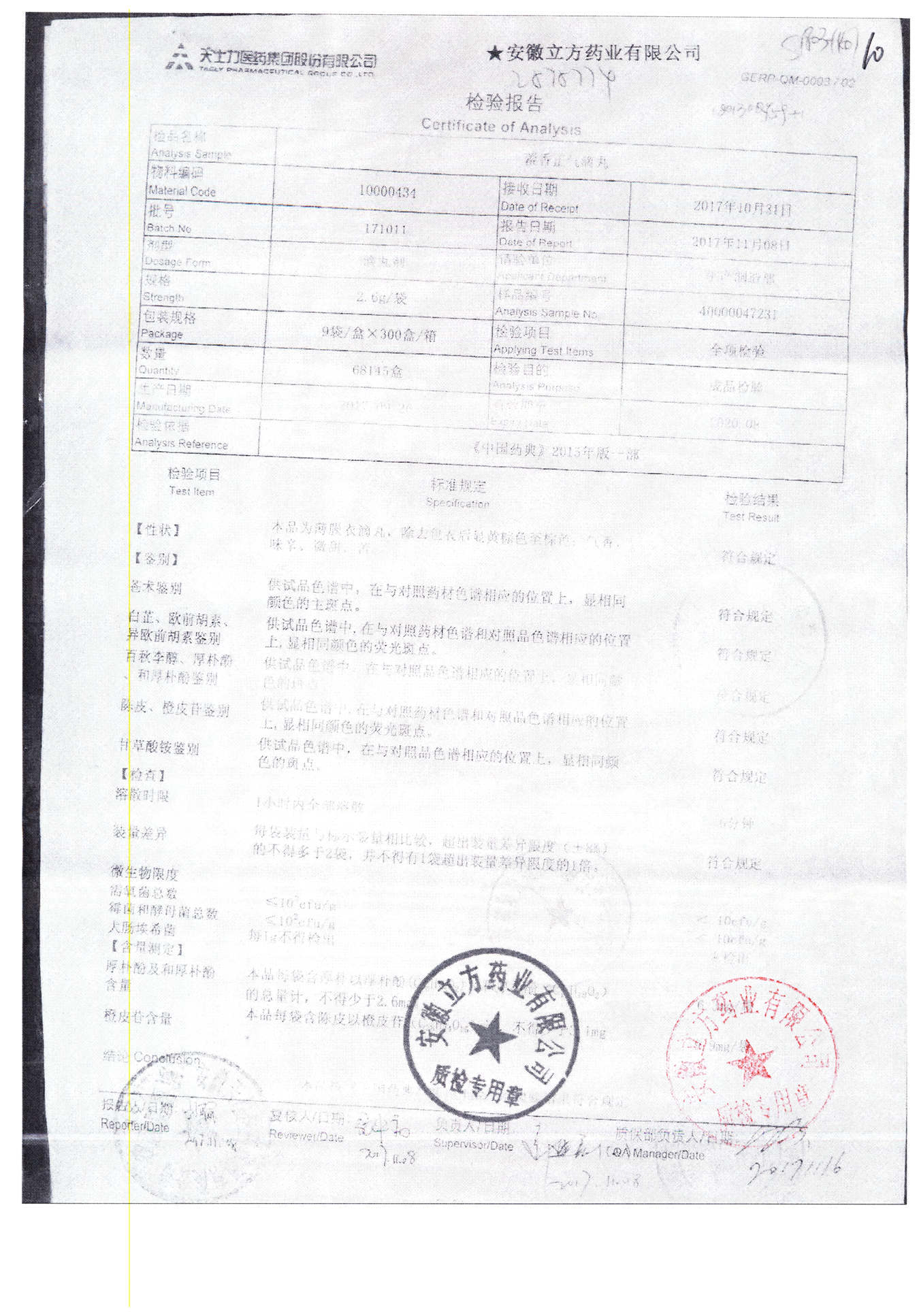 | 名稱 | 規格 | 批號 | 藥檢報告 |