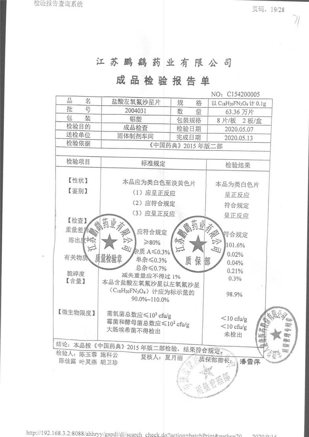 | 鹽酸左氧氟沙星片 | 16s | 2004031 | 查看詳情 |