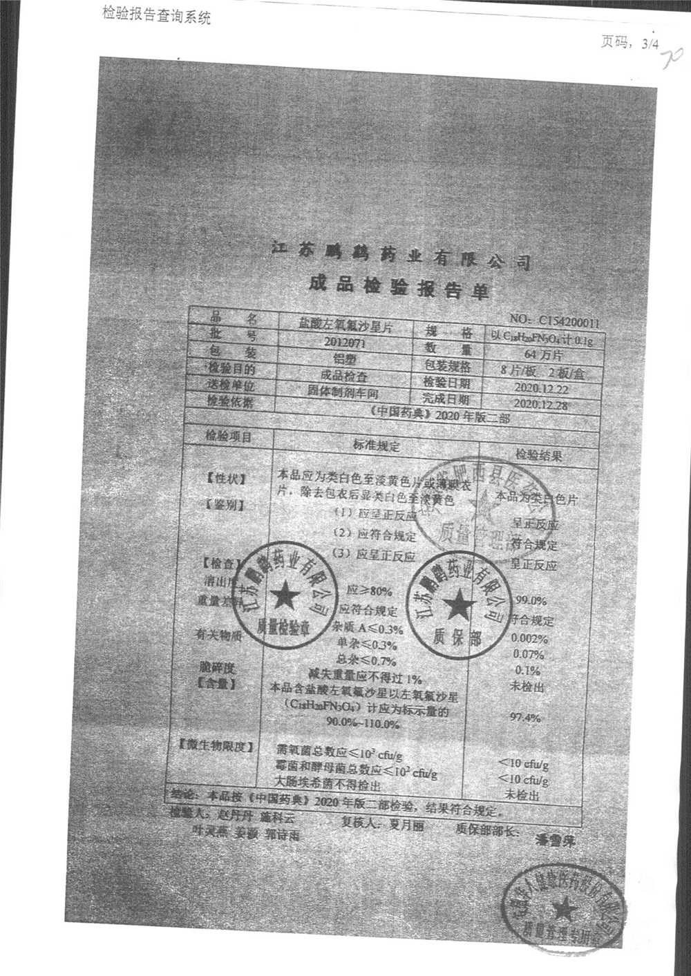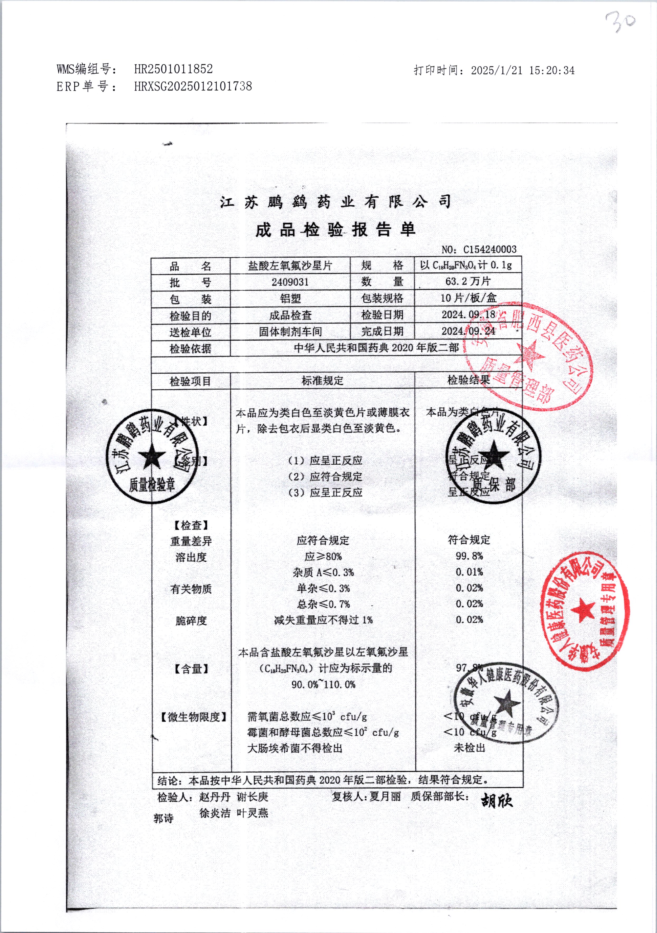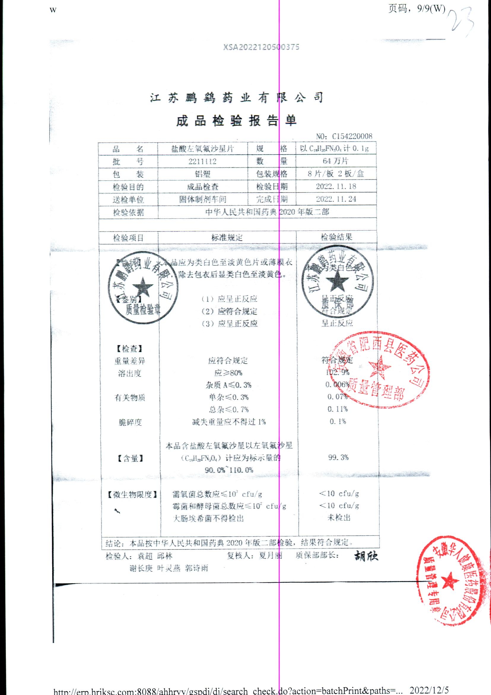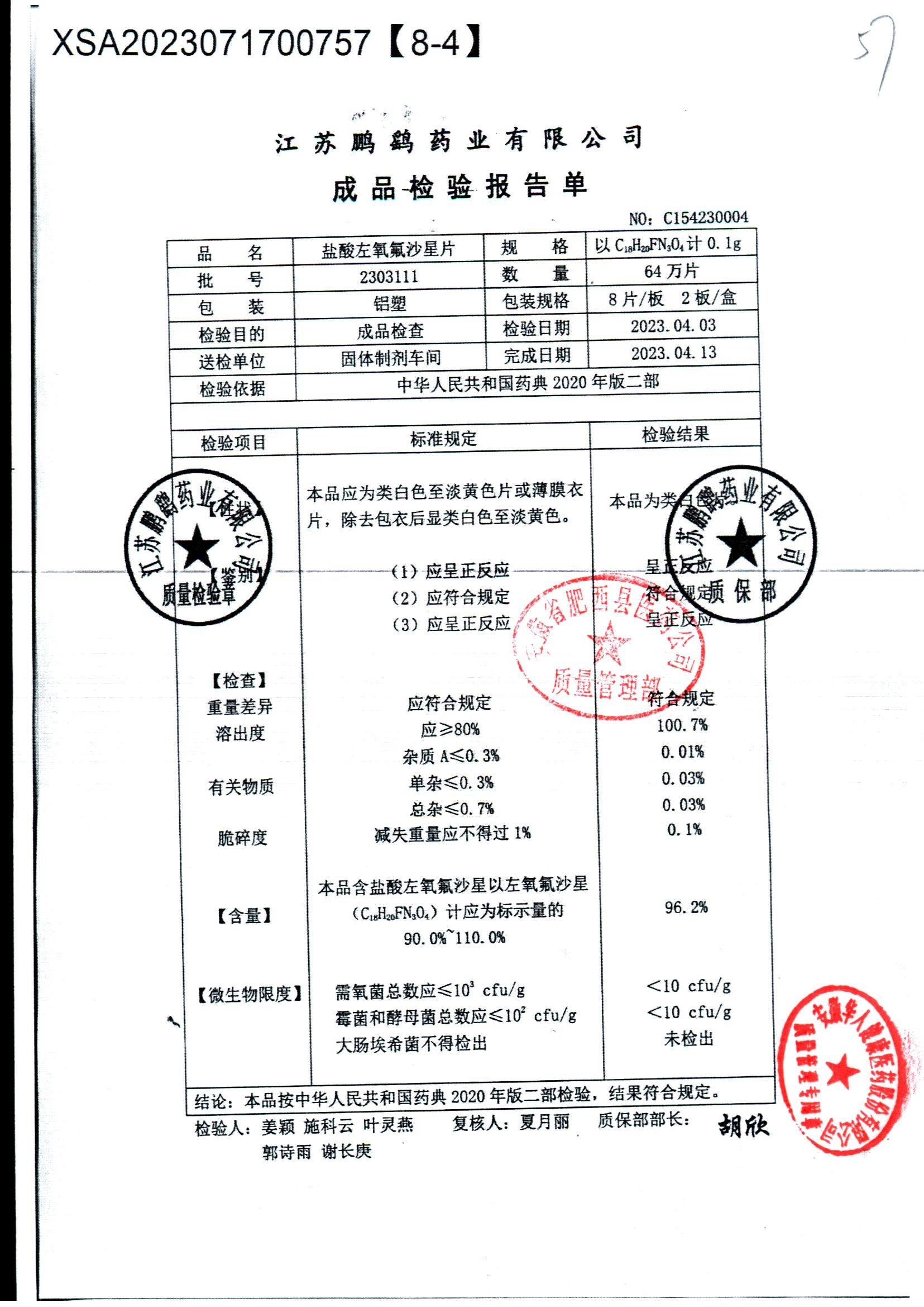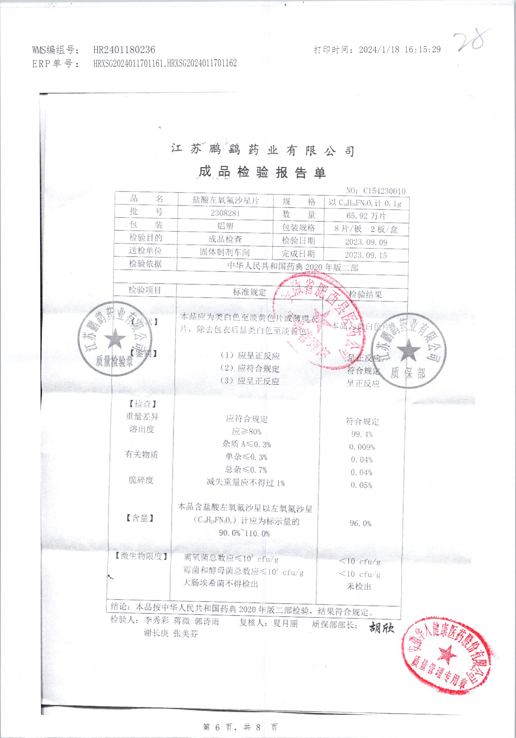 | 鹽酸左氧氟沙星片 | 16s | 2312051 | 查看詳情 |