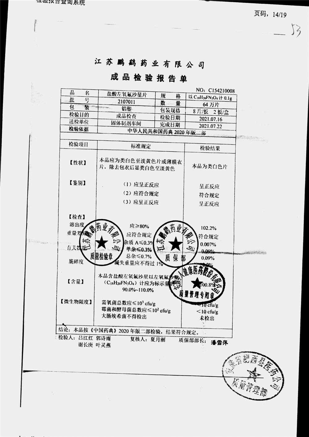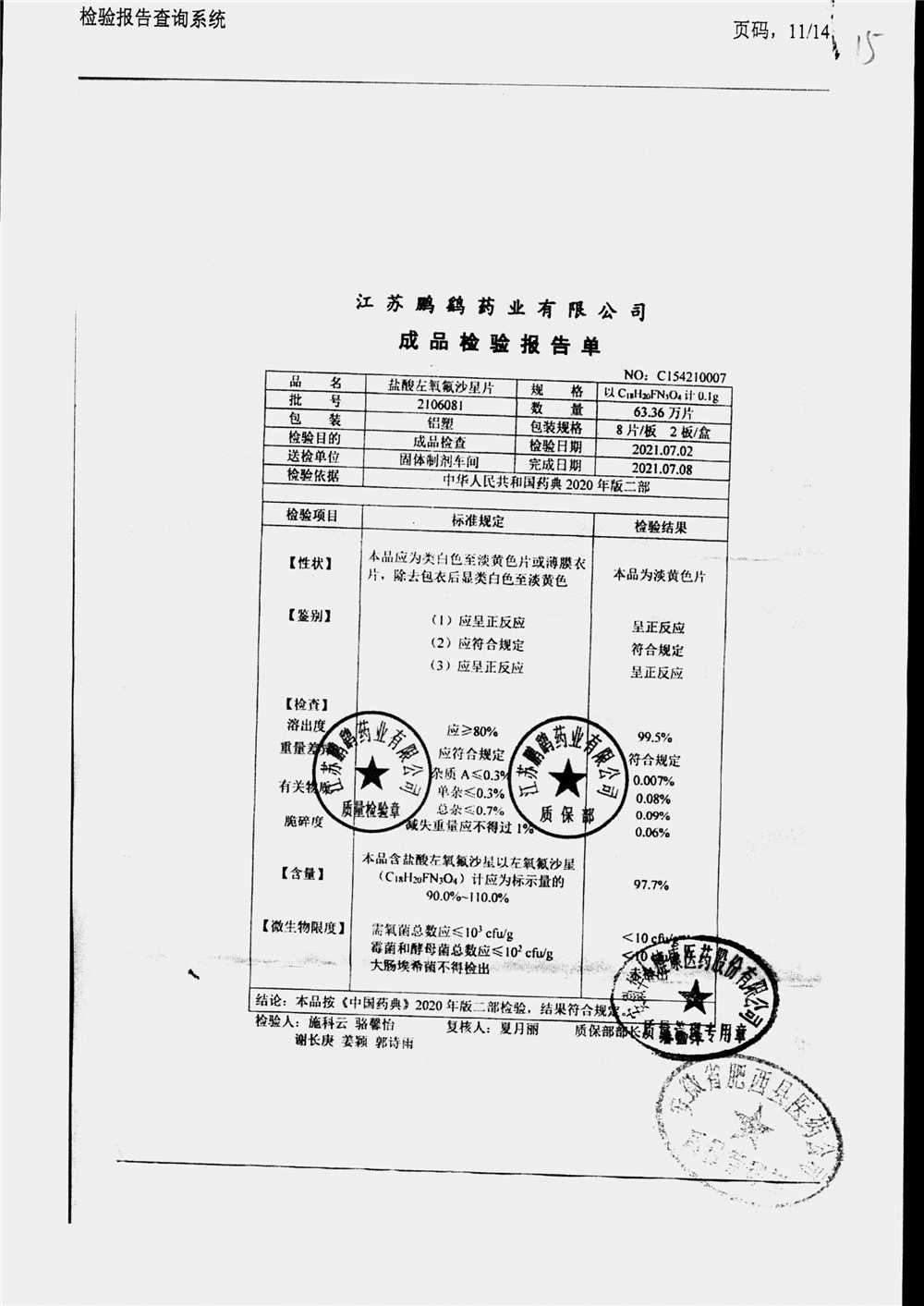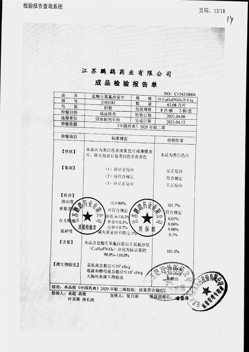 | 鹽酸左氧氟沙星片 | 16s | 2106081 | 查看詳情 |