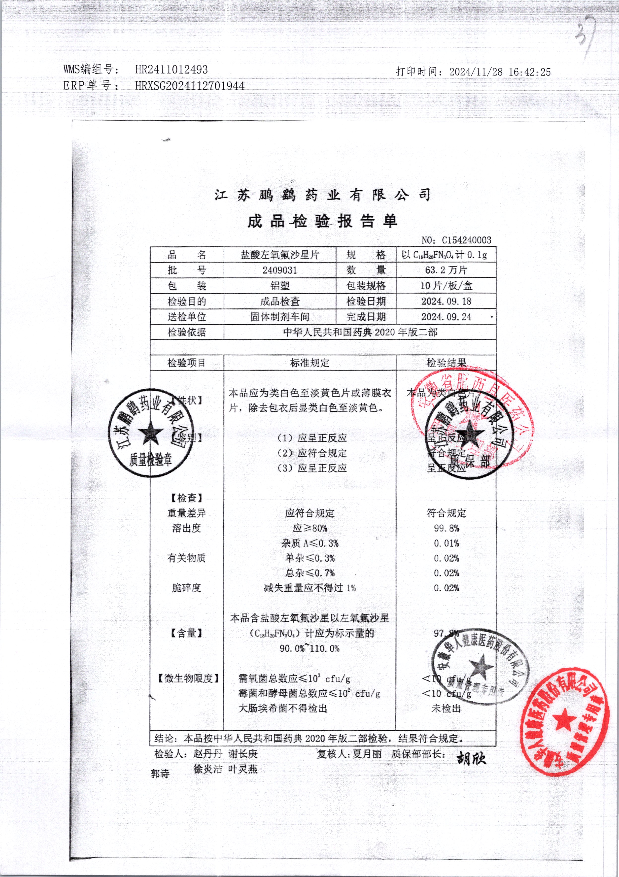 | 鹽酸左氧氟沙星片 | 16s | 2412131 | 查看詳情 |