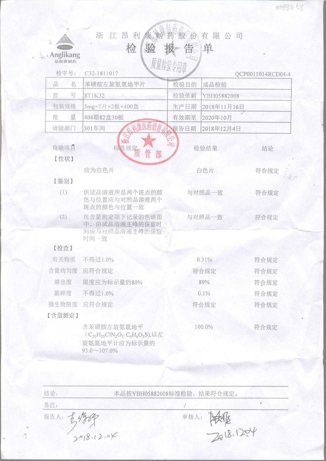苯磺酸左旋氨氯地平片 5mg*7s 8T1A35 查看詳情