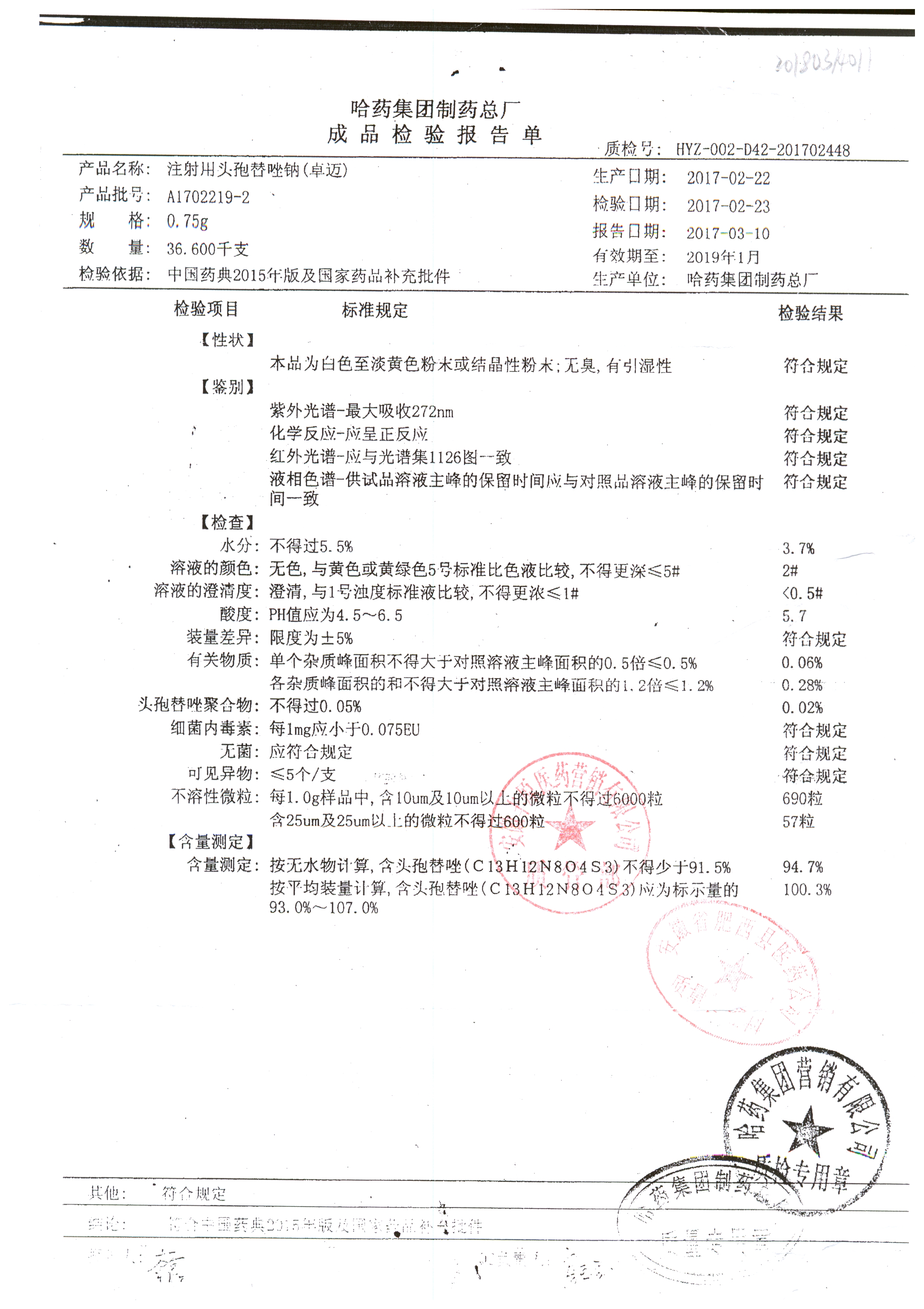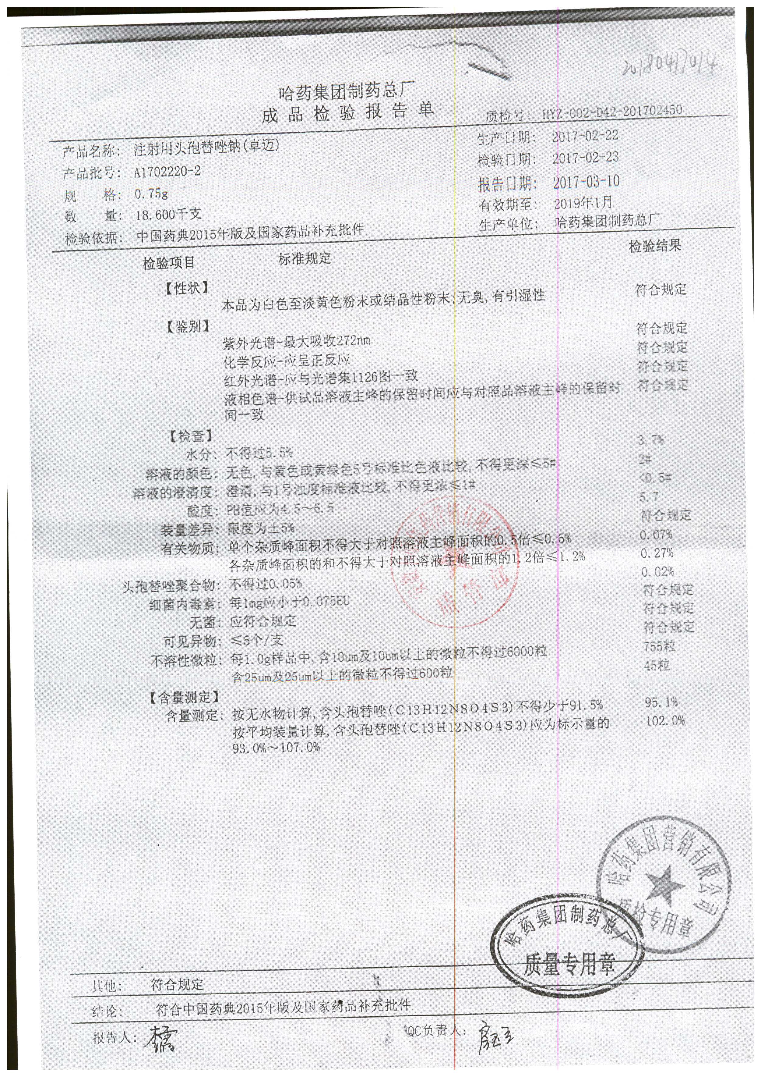 注射用頭孢替唑鈉 0.75g A1702219--2 查看詳情