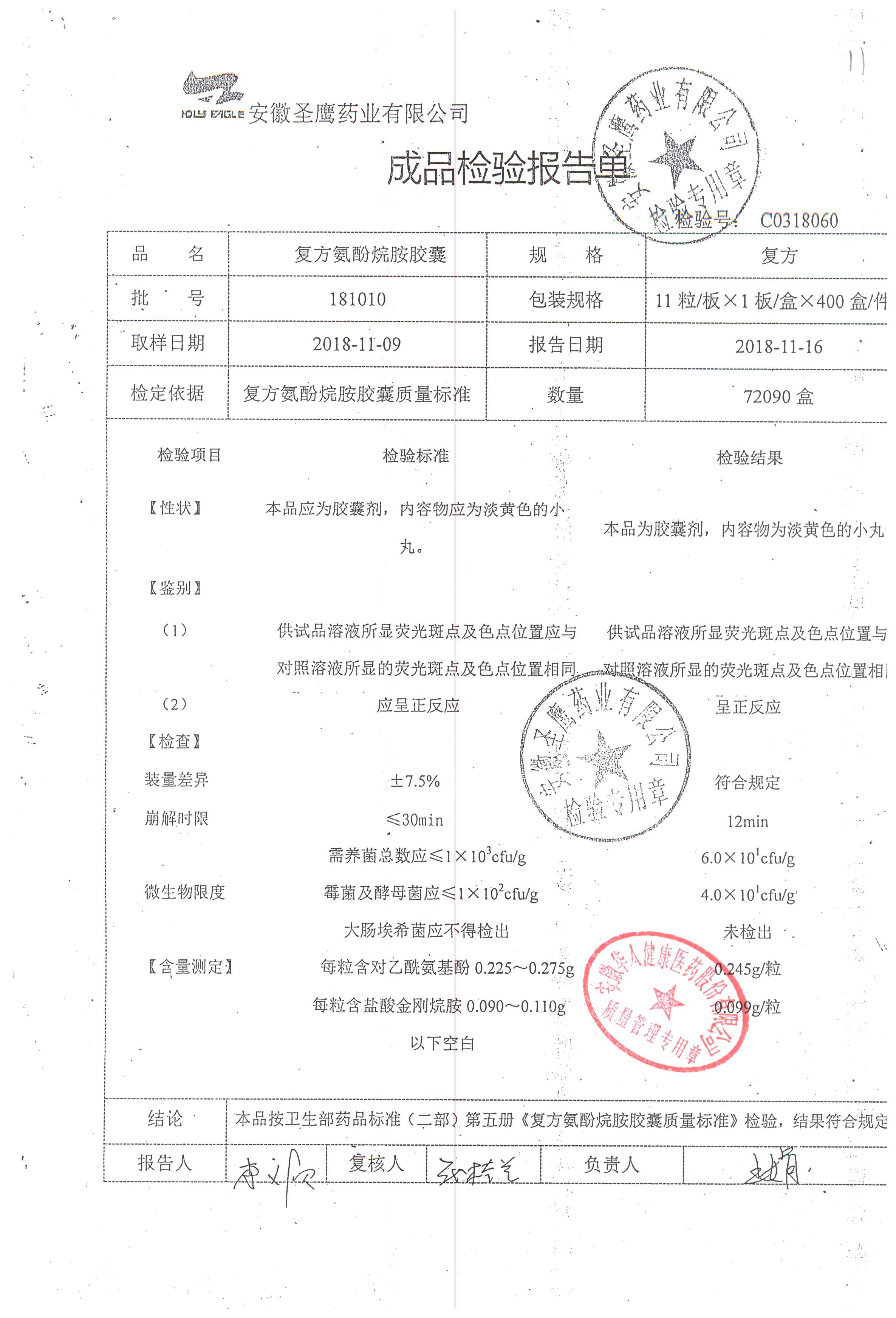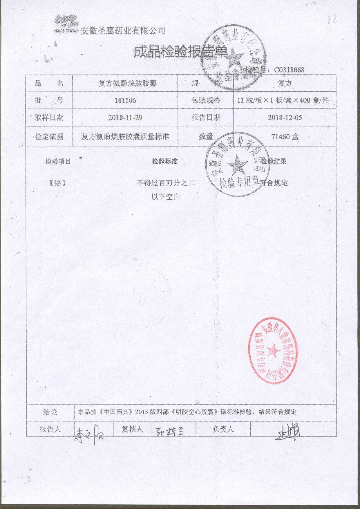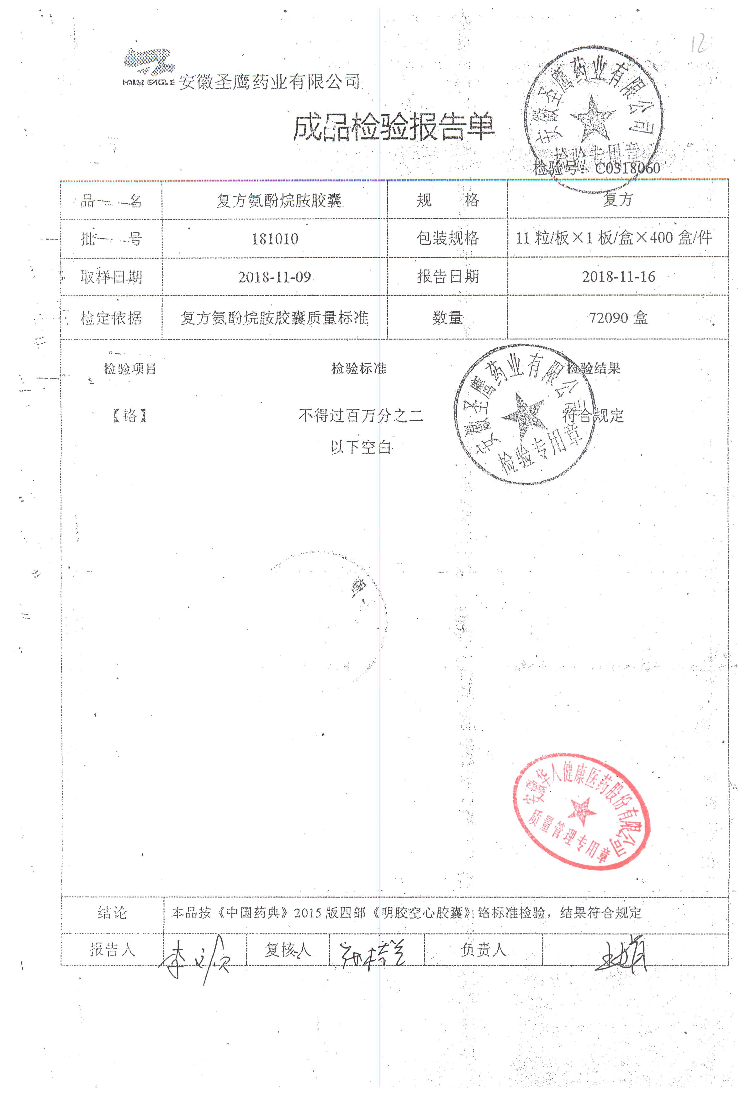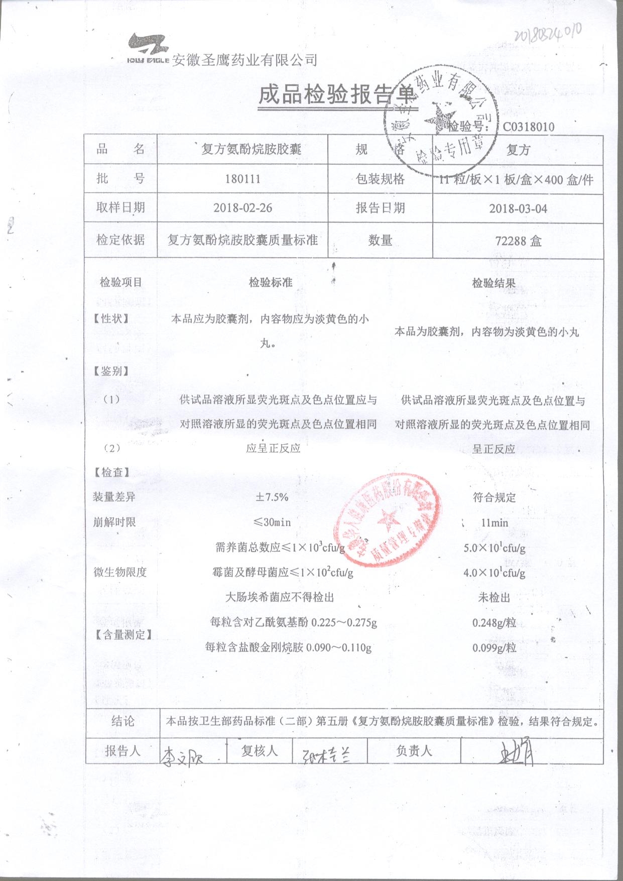 | 復方氨酚烷胺膠囊 | 11s*1 | 180405(1/2) | 查看詳情 |