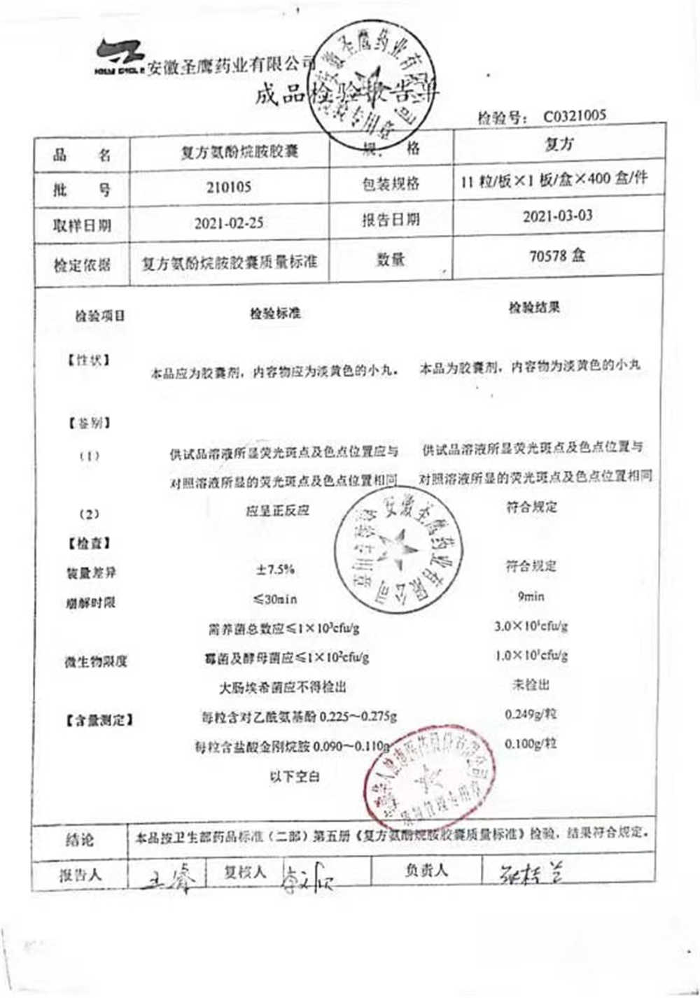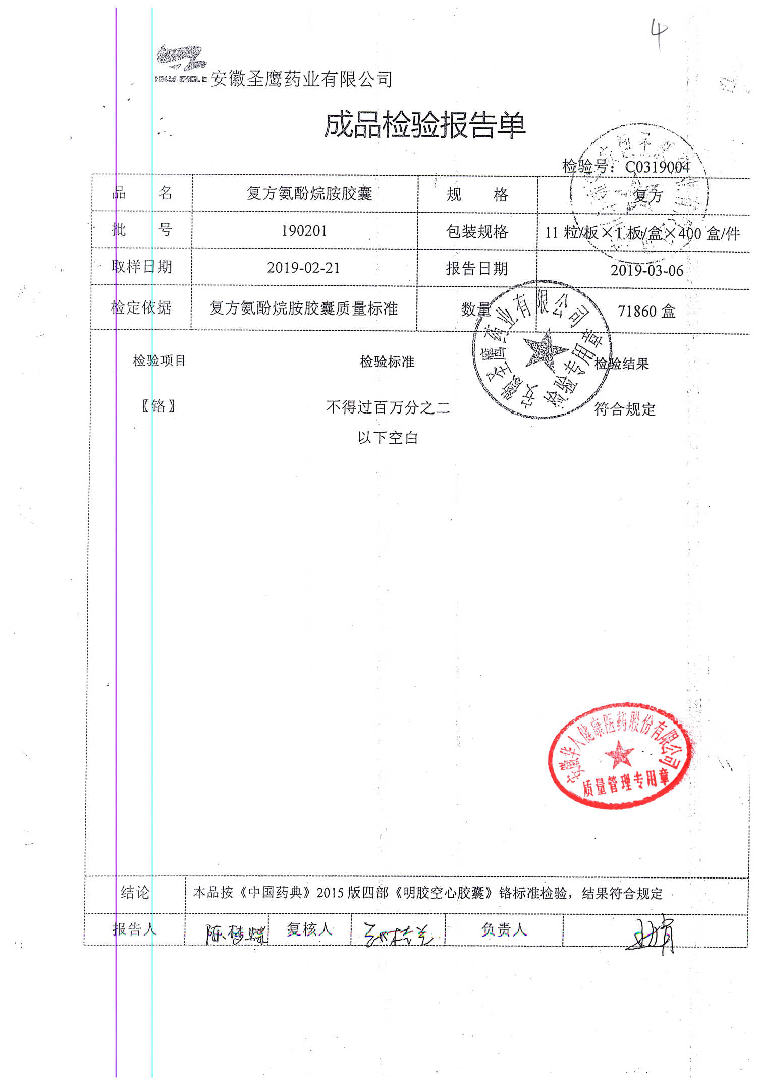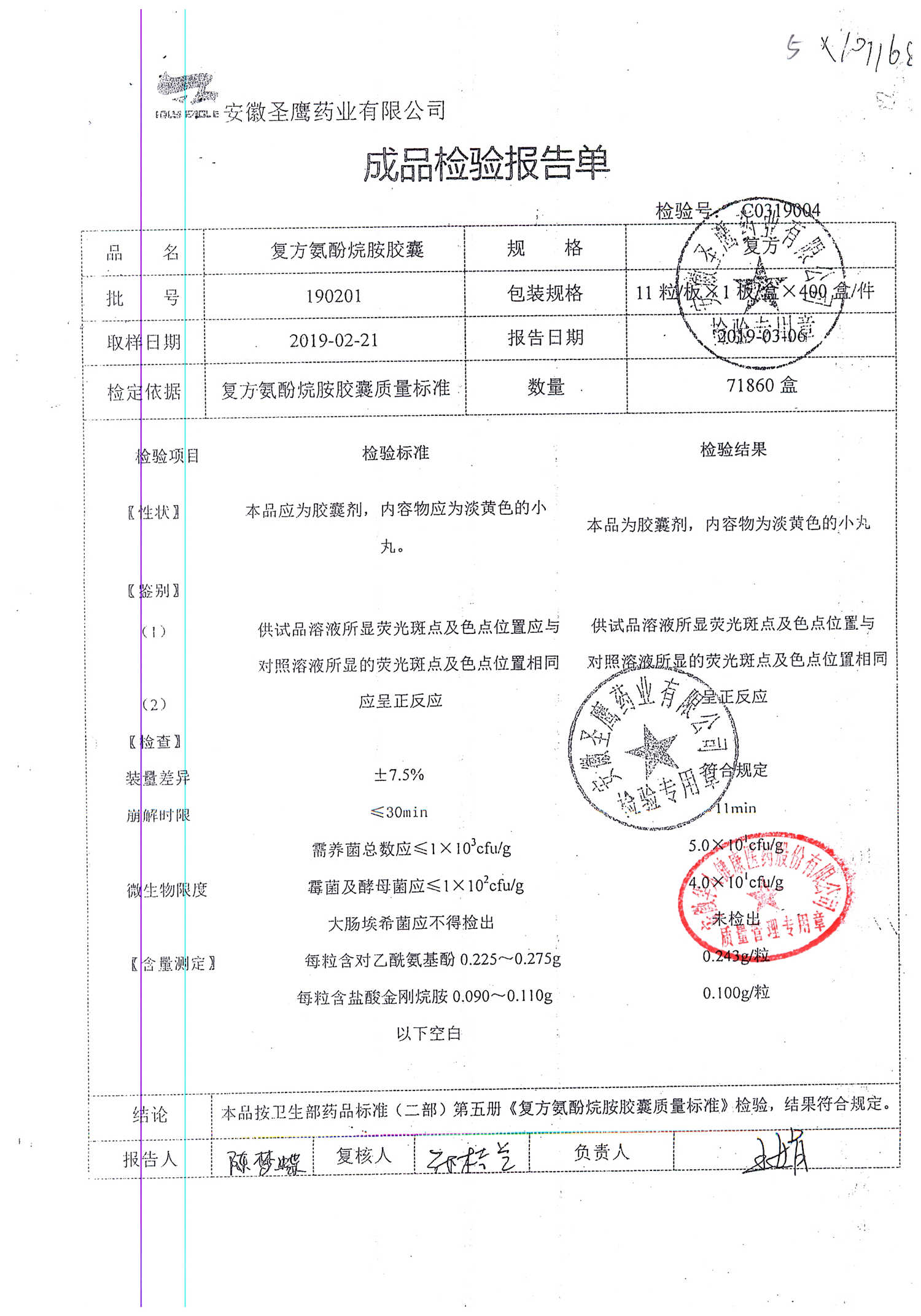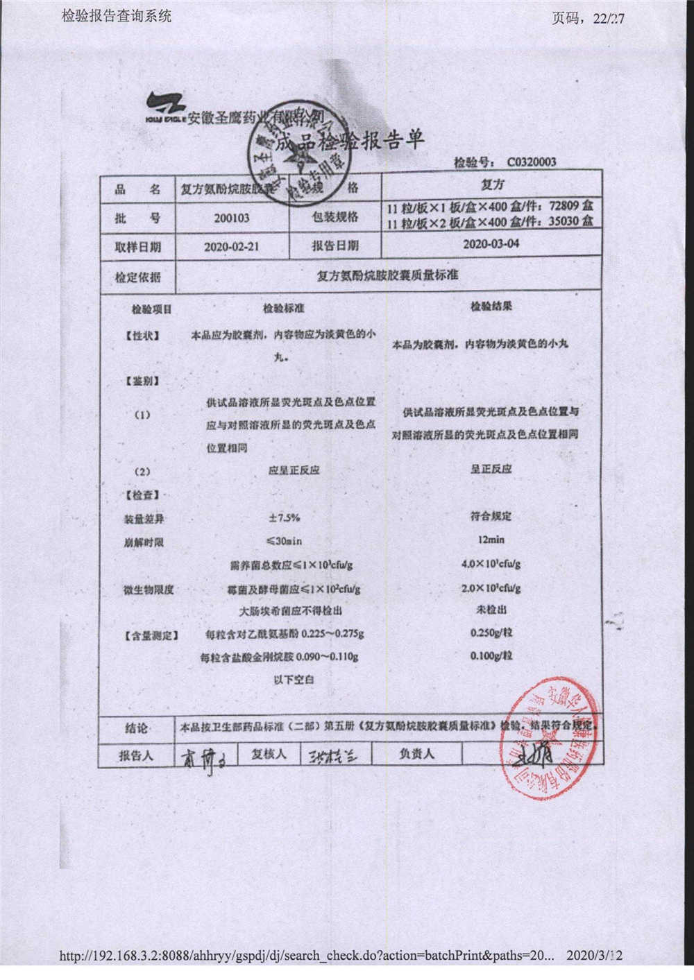 | 復方氨酚烷胺膠囊 | 11s*1 | 190501 | 查看詳情 |