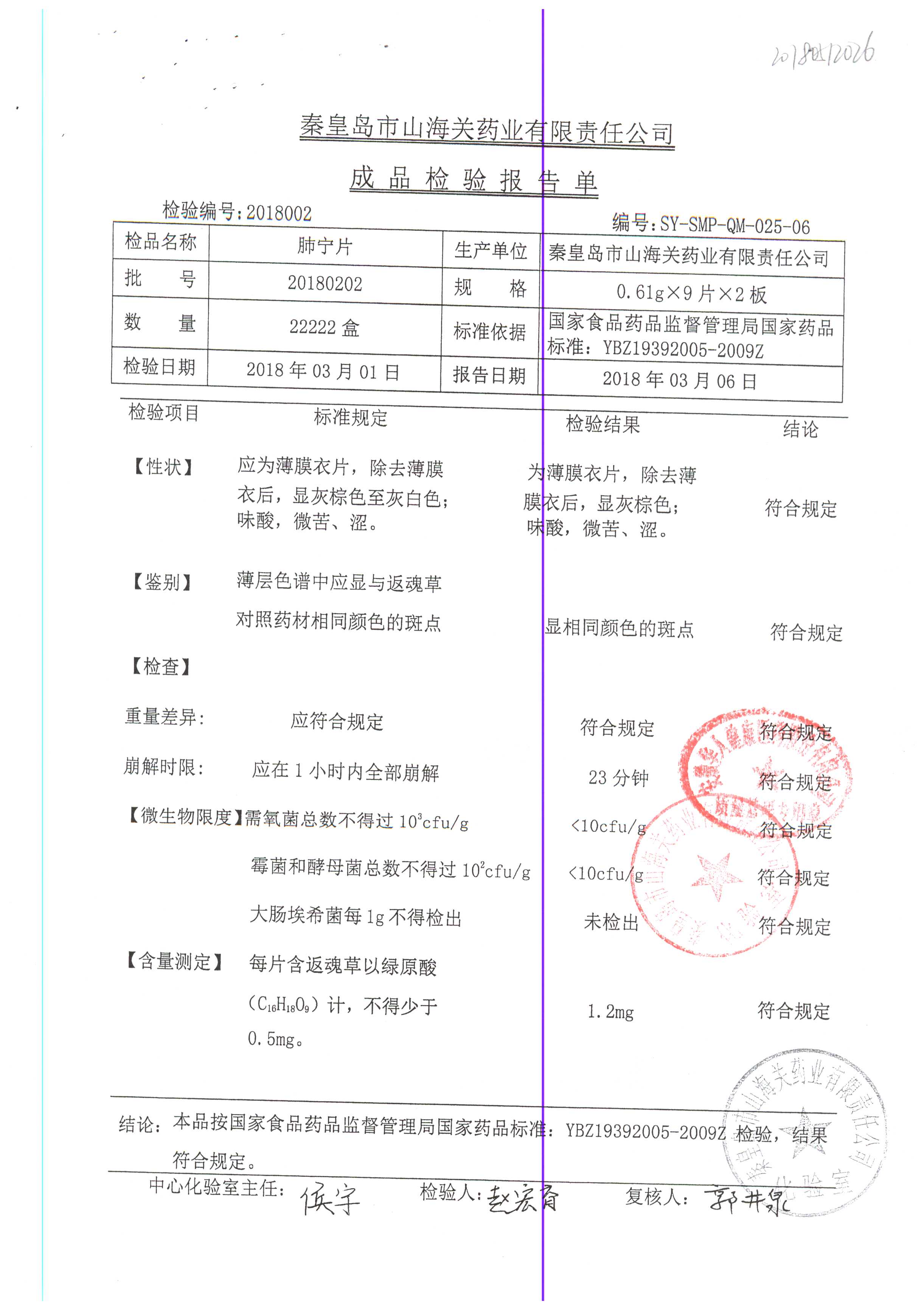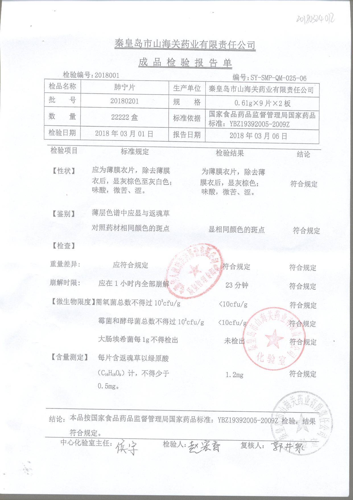 | 肺寧片 | 0.61g*18s | 20181201 | 查看詳情 |