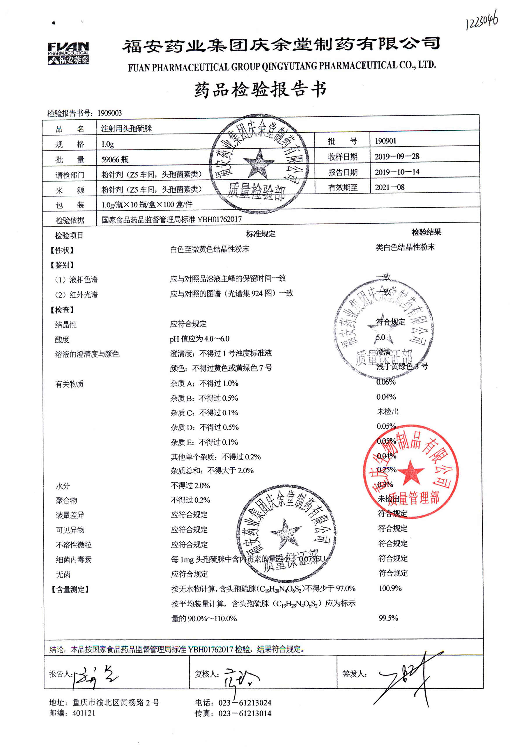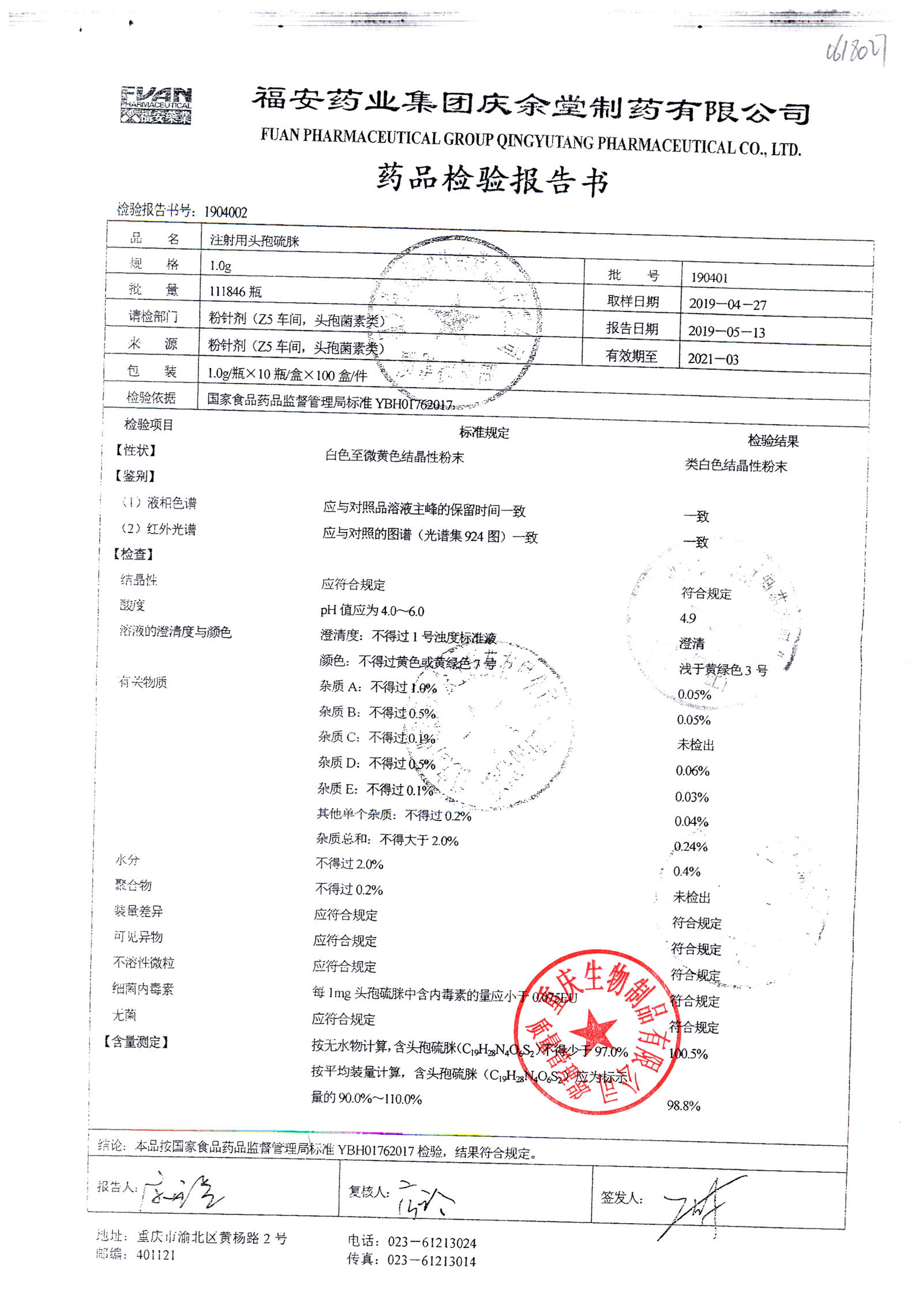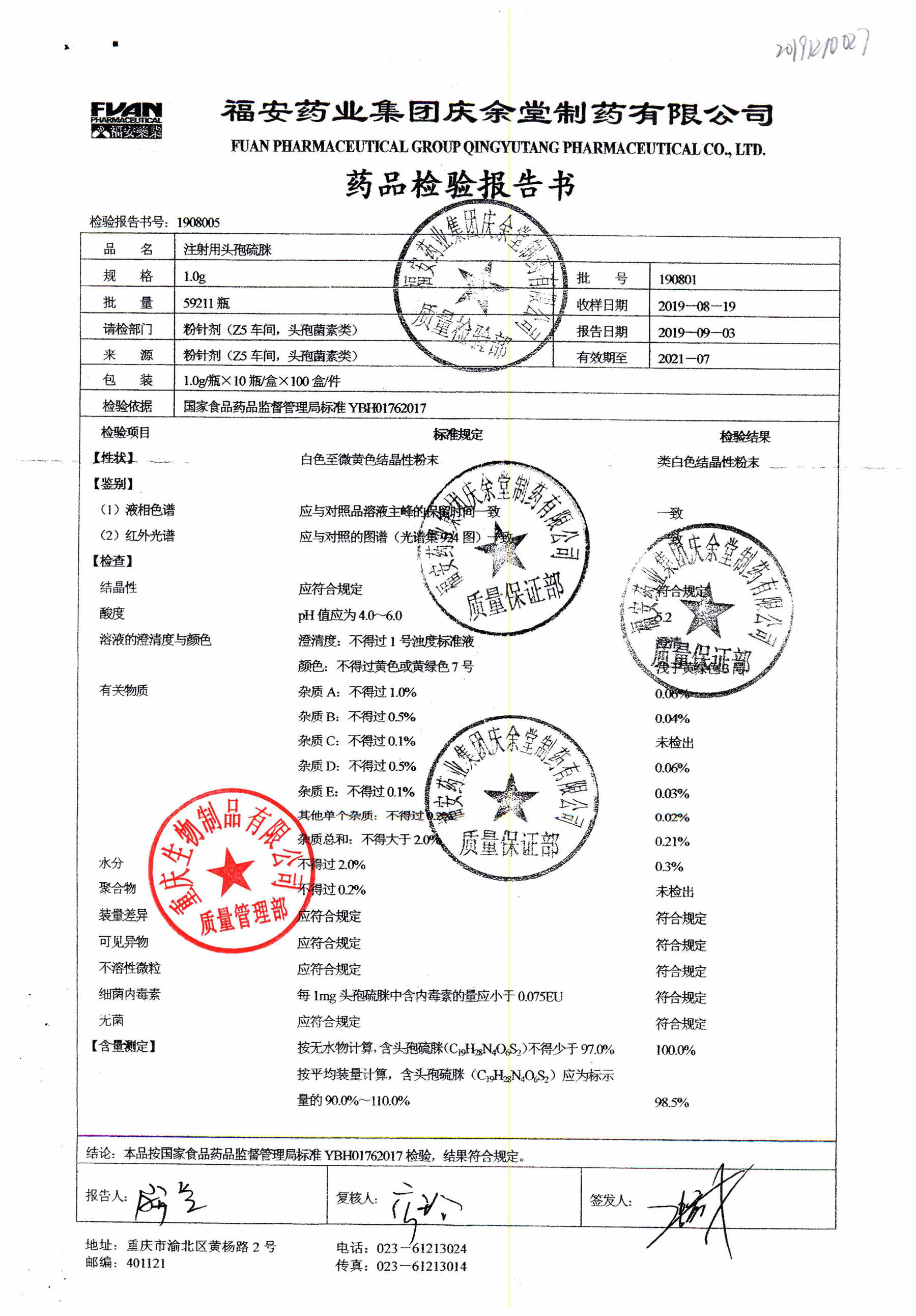 | 注射用頭孢硫脒 | 1g*10瓶 | 190601 | 查看詳情 |
