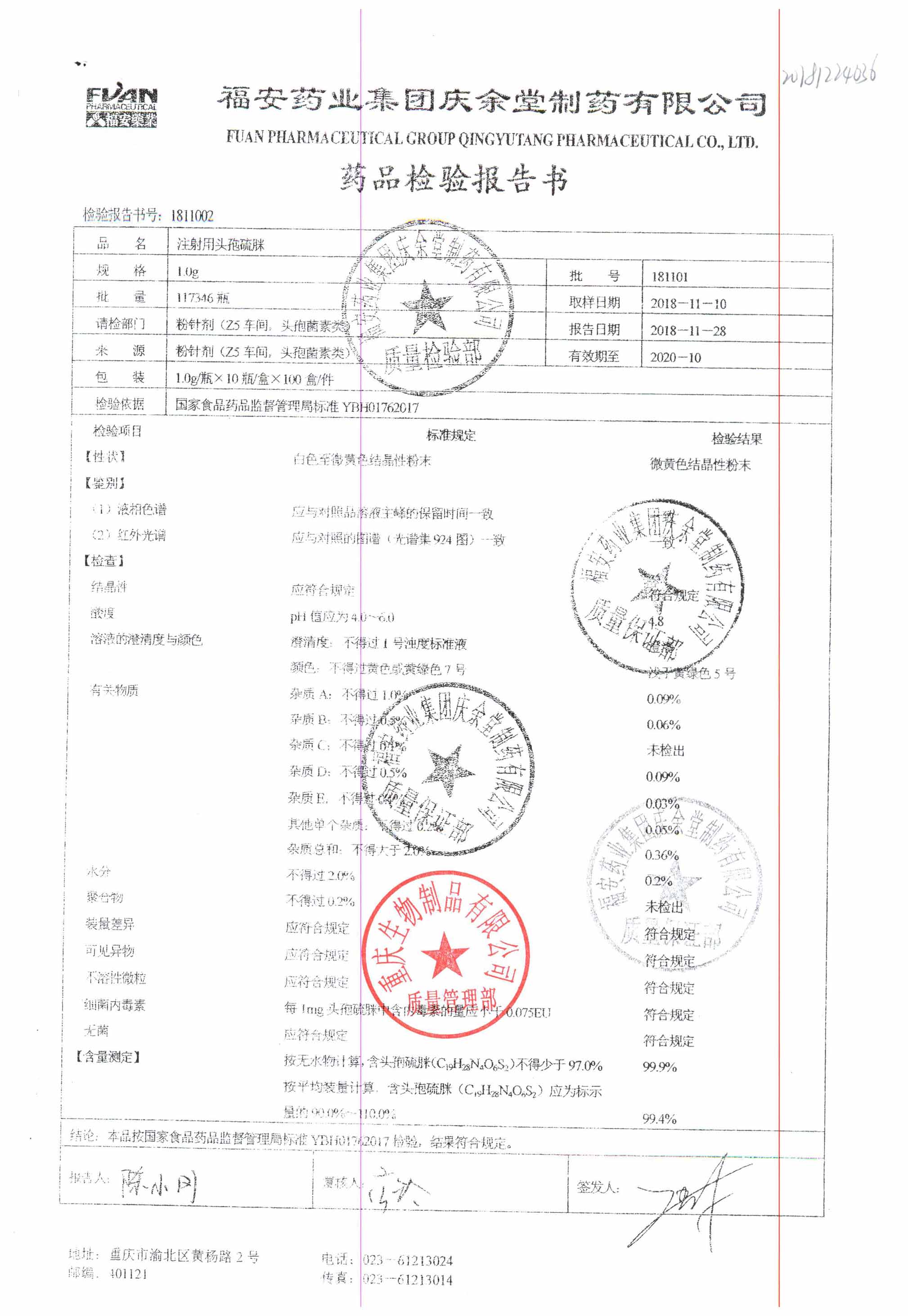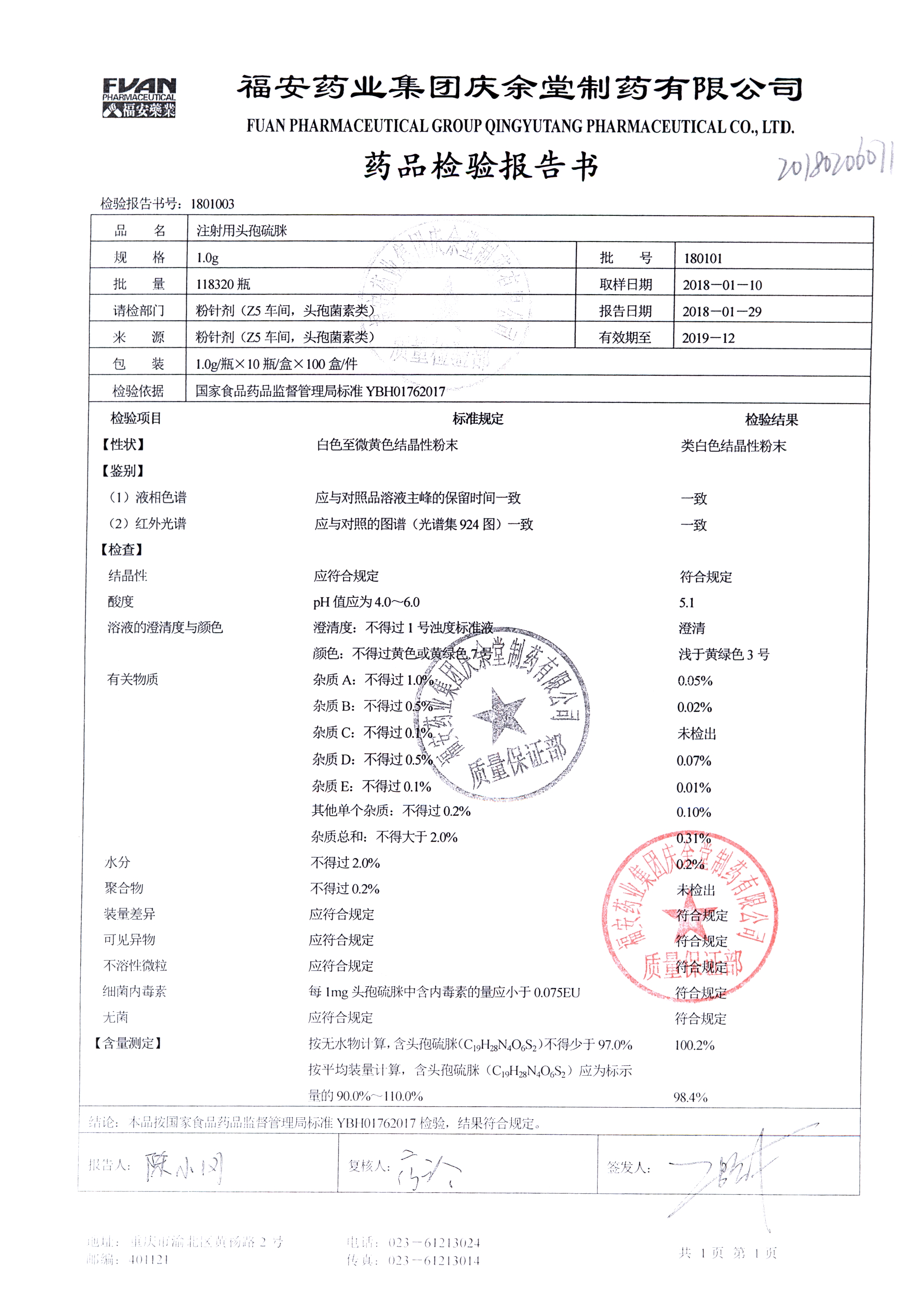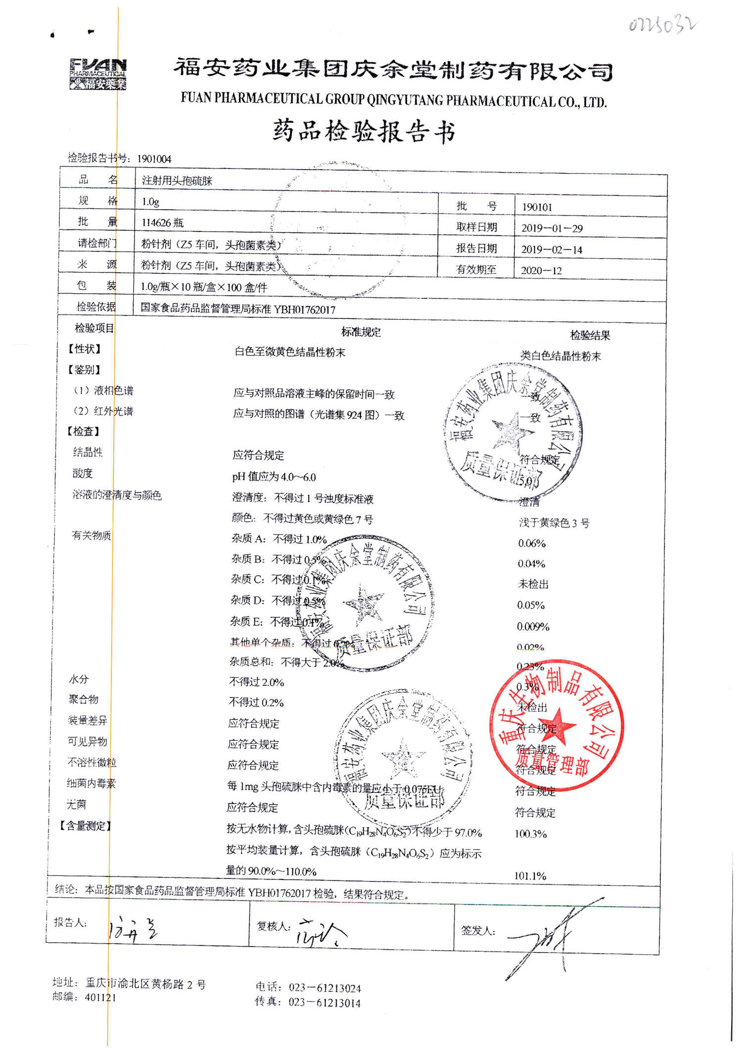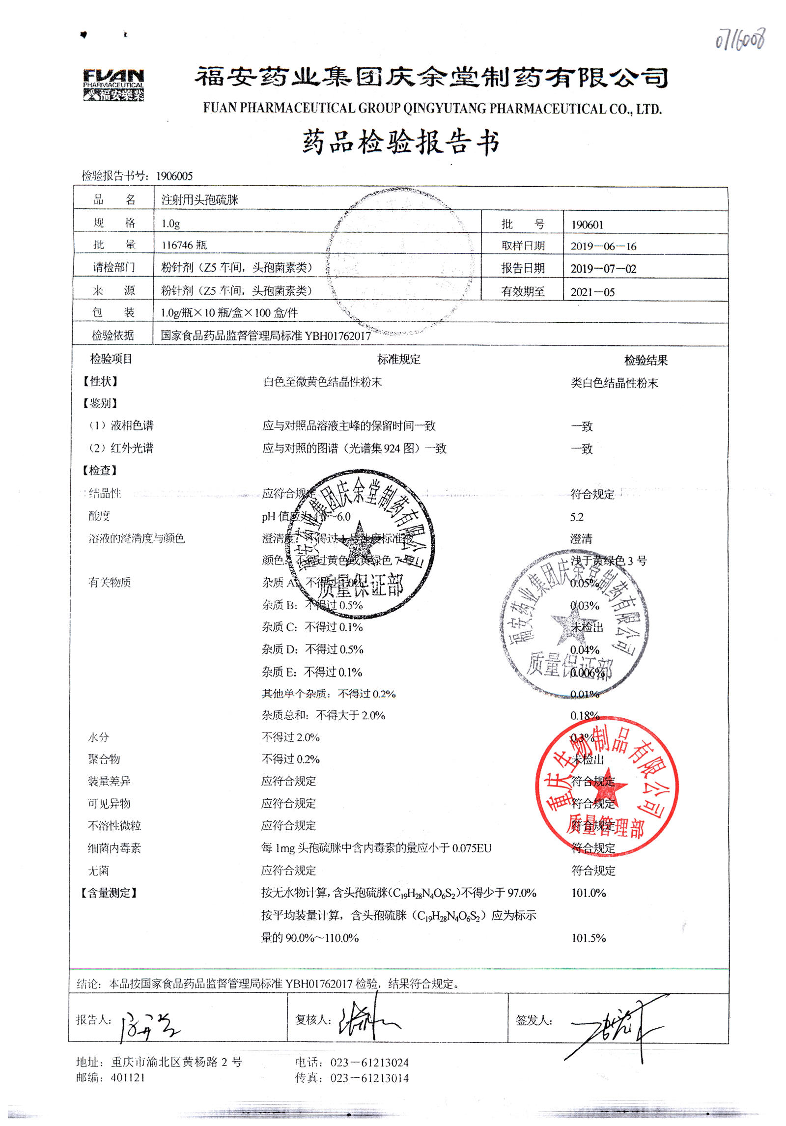| 注射用頭孢硫脒 | 1g*10瓶 | 190601 | 查看詳情 |