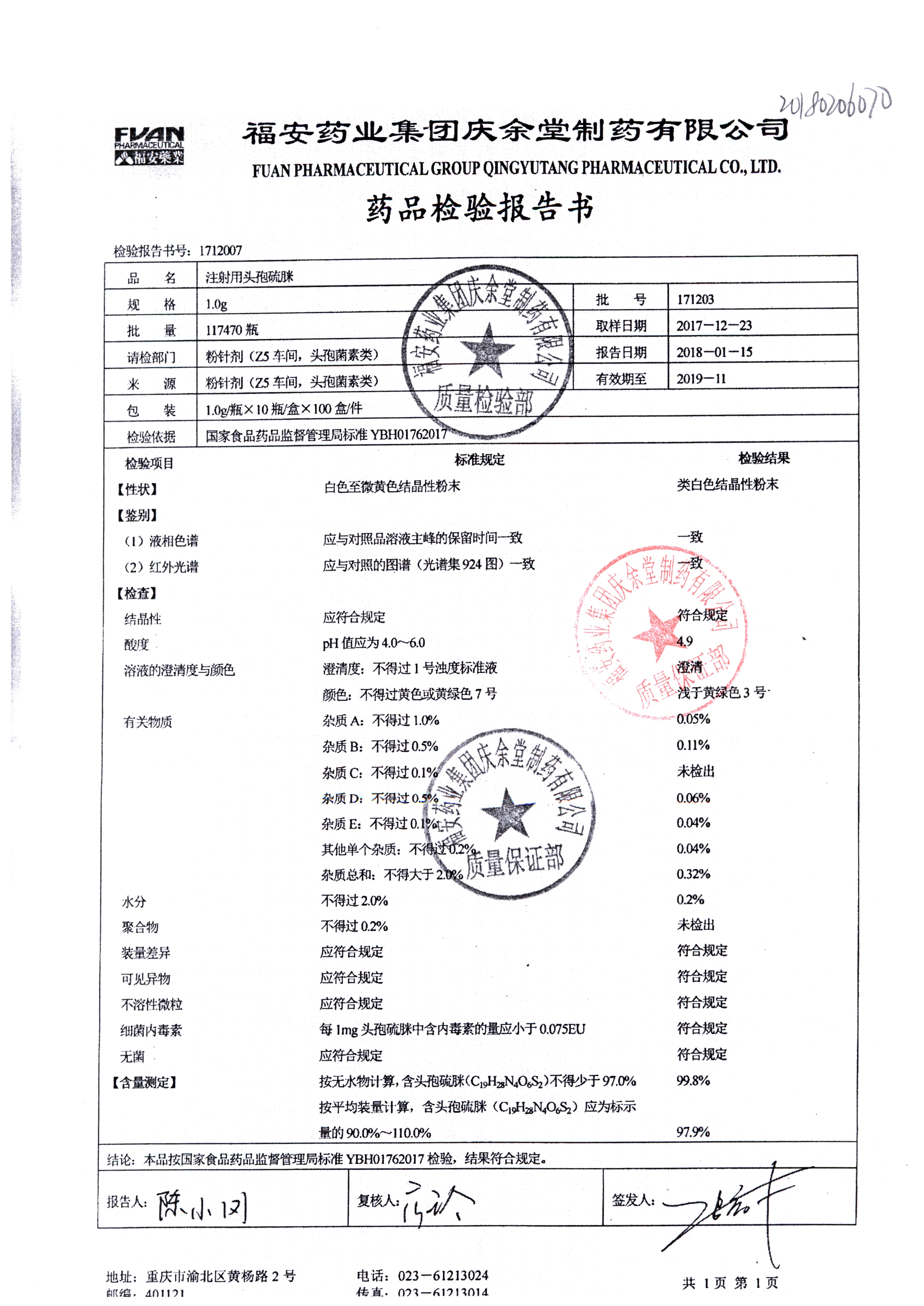 | 注射用頭孢硫脒 | 1g*10瓶 | 190801 | 查看詳情 |