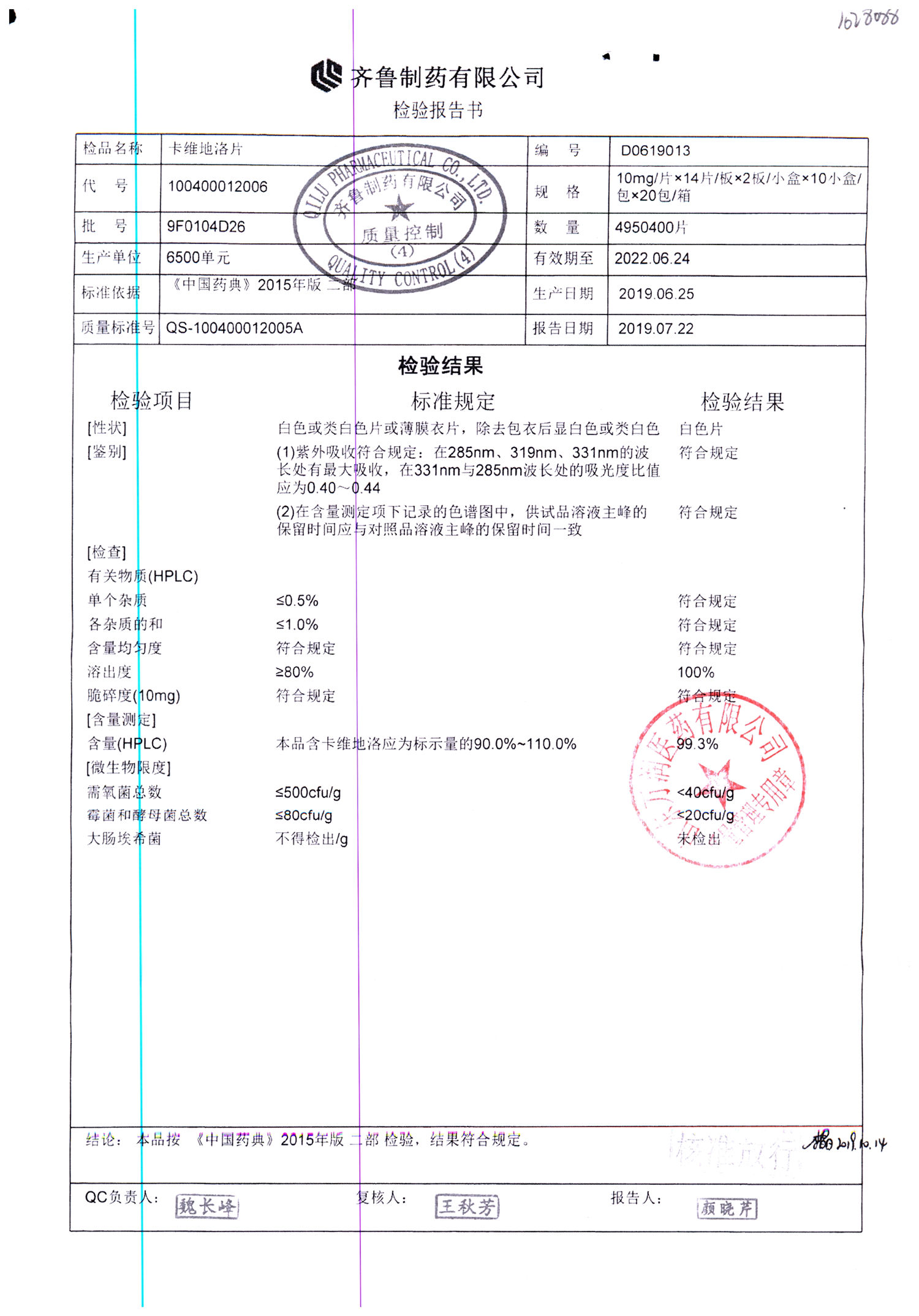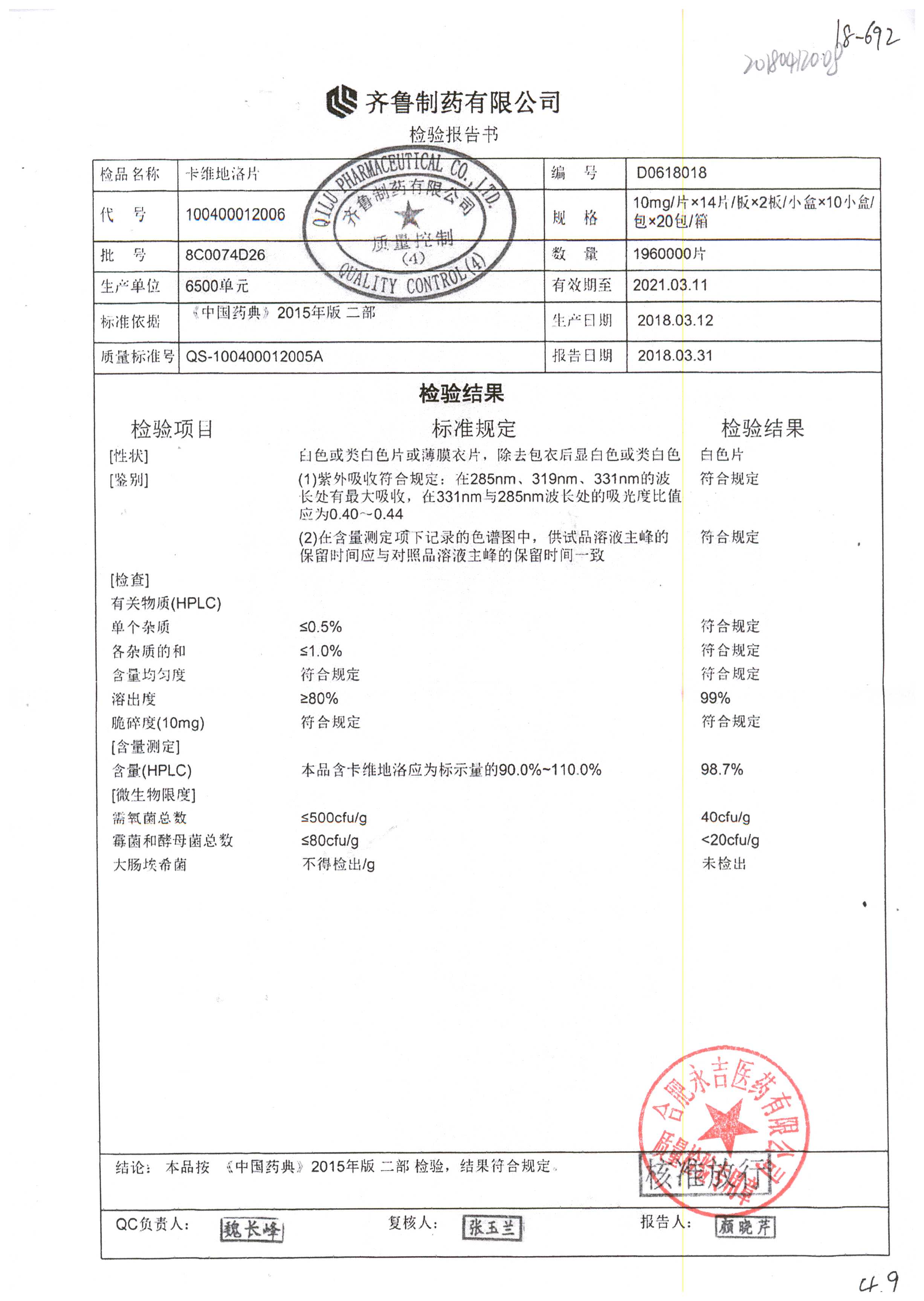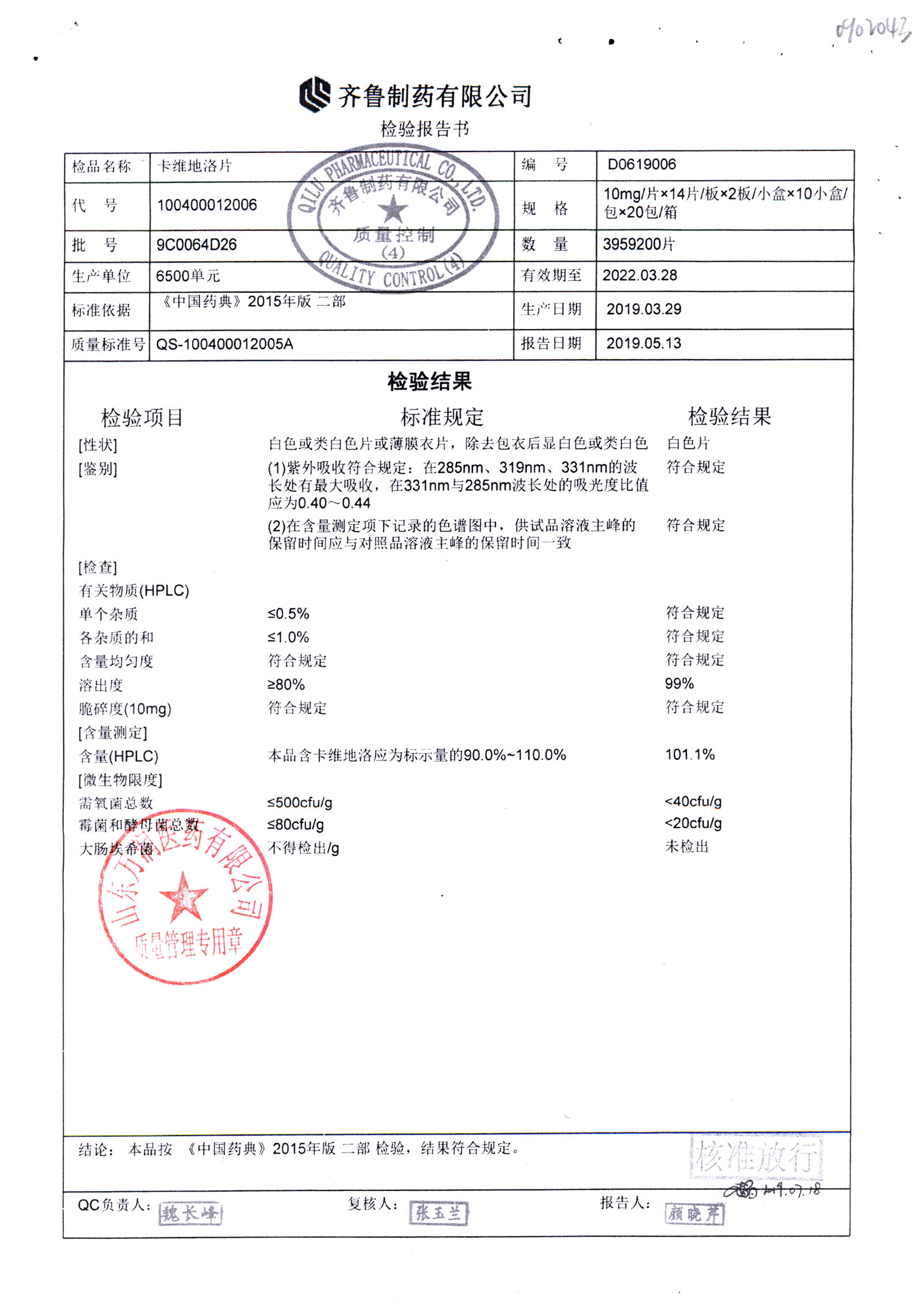 | 卡維地洛片 | 10mg*14*2 | 9G0114D26 | 查看詳情 |