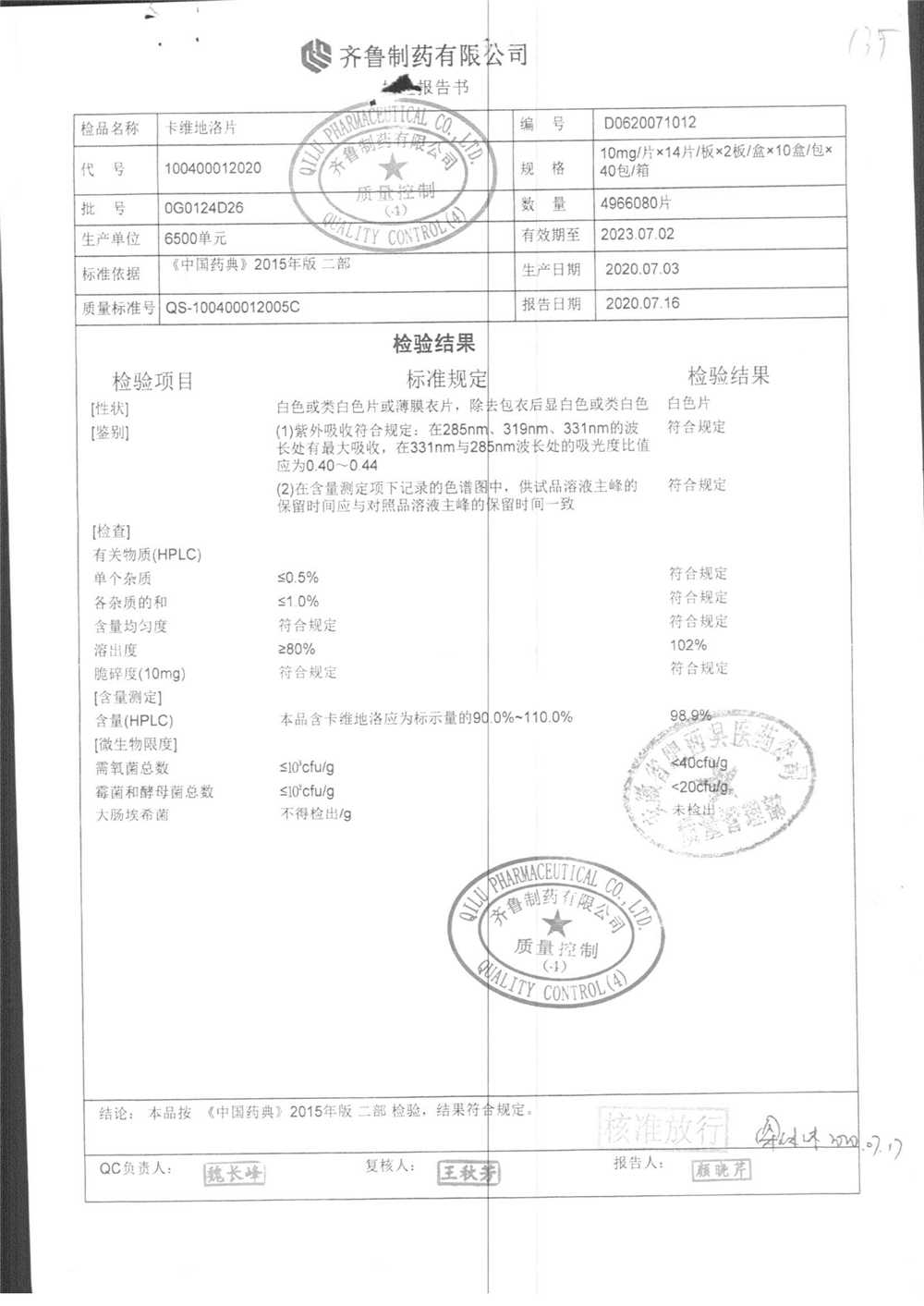 | 卡維地洛片 | 10mg*14*2 | 8C0124D26 | 查看詳情 |