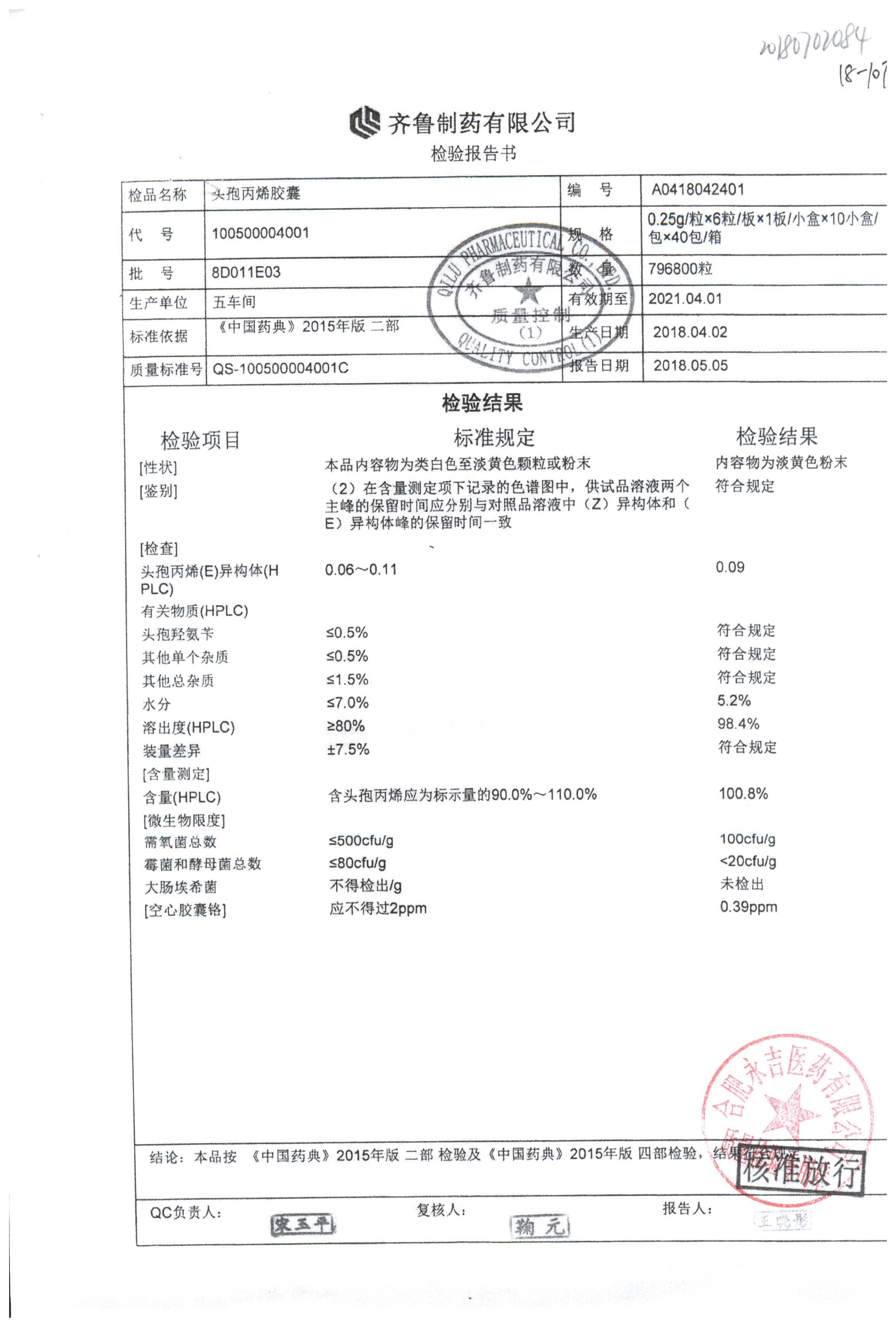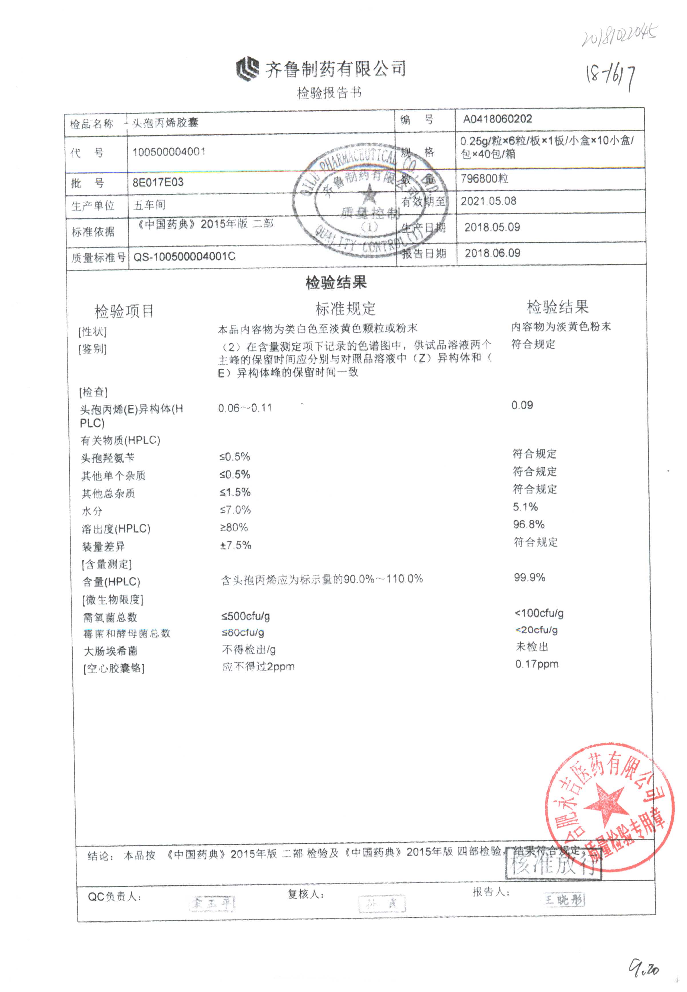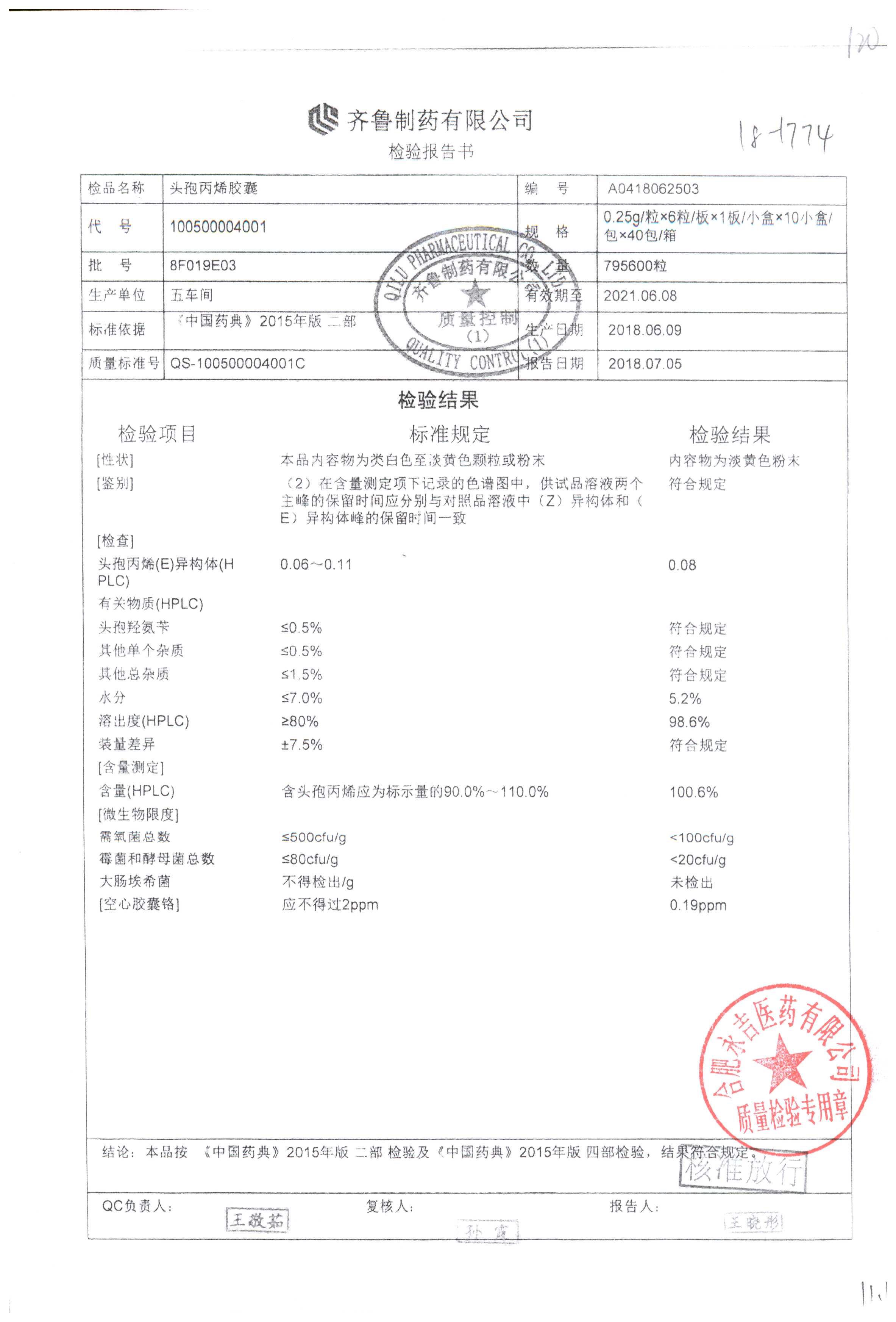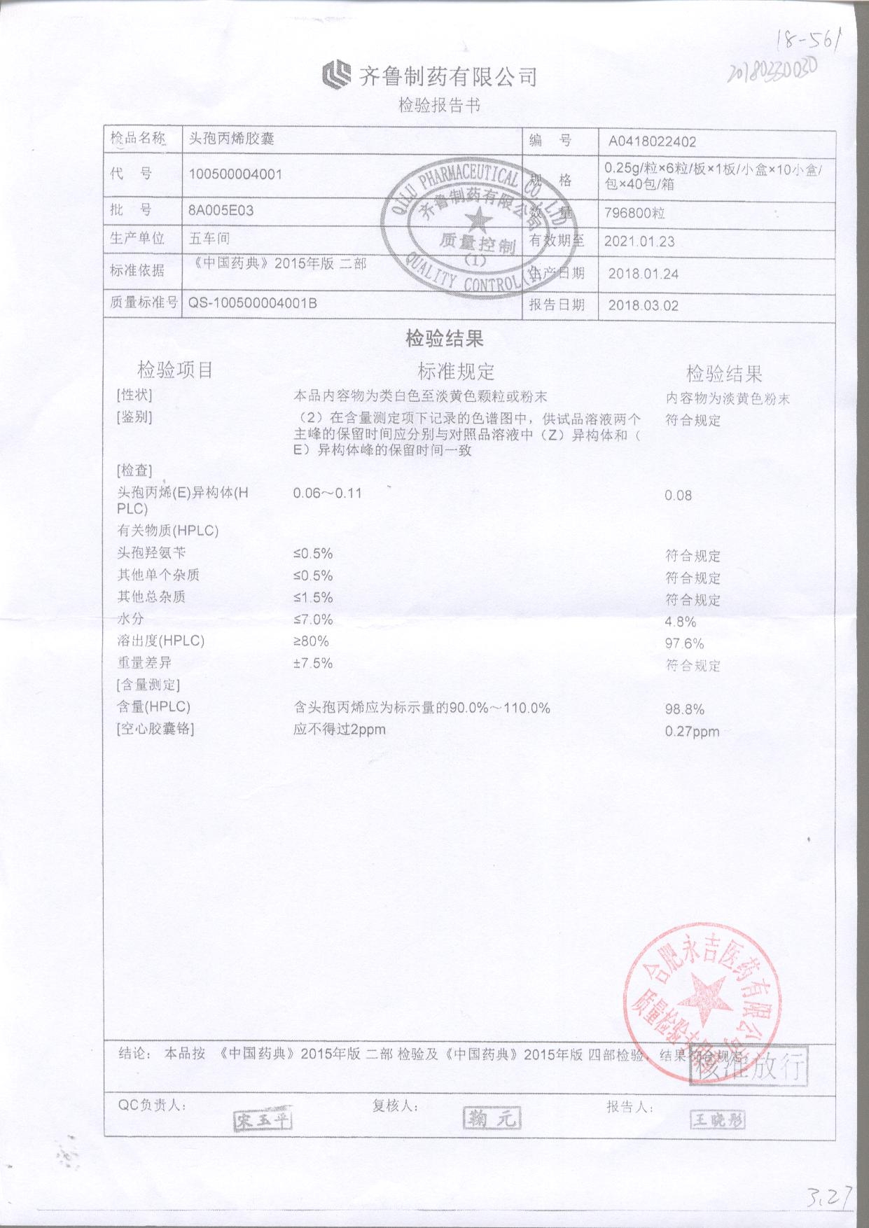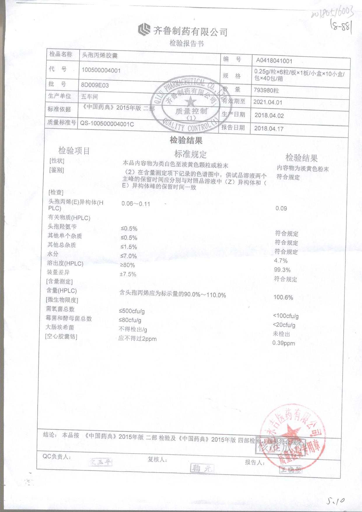 | 頭孢丙烯膠囊 | 0.25g*6s | 8J030E03 | 查看詳情 |
