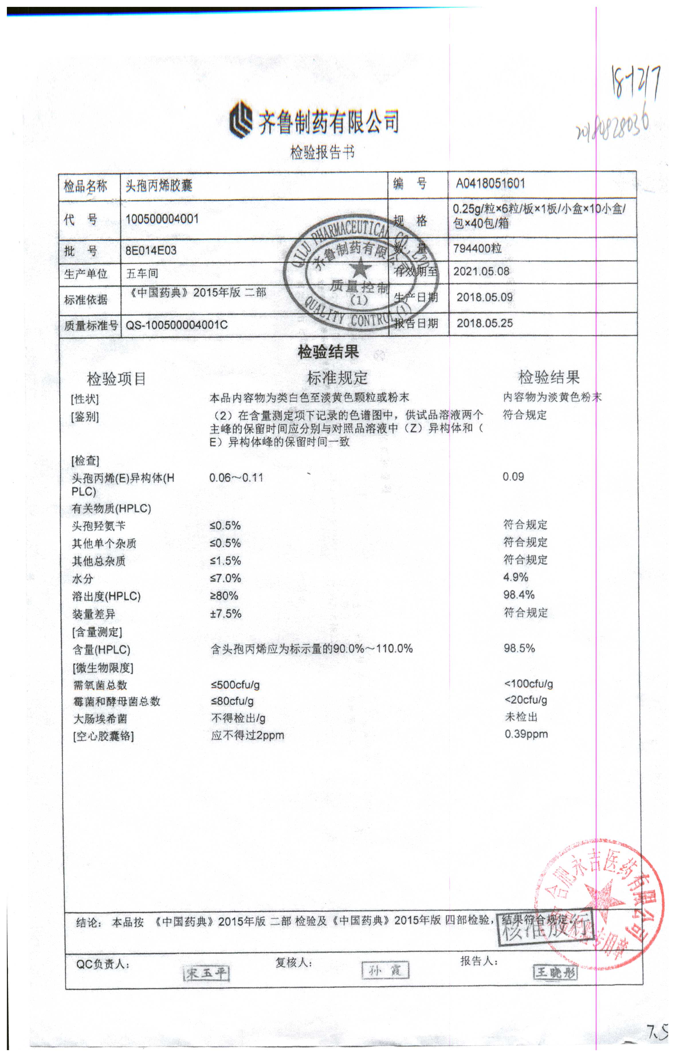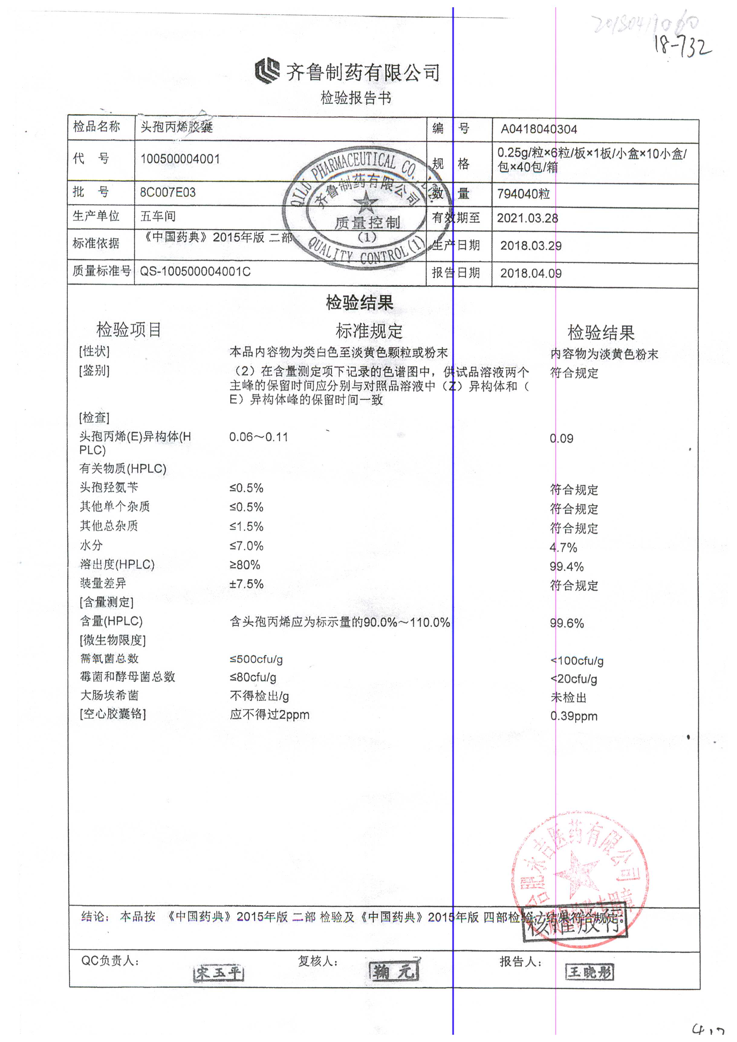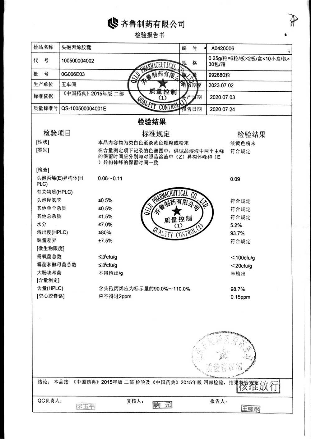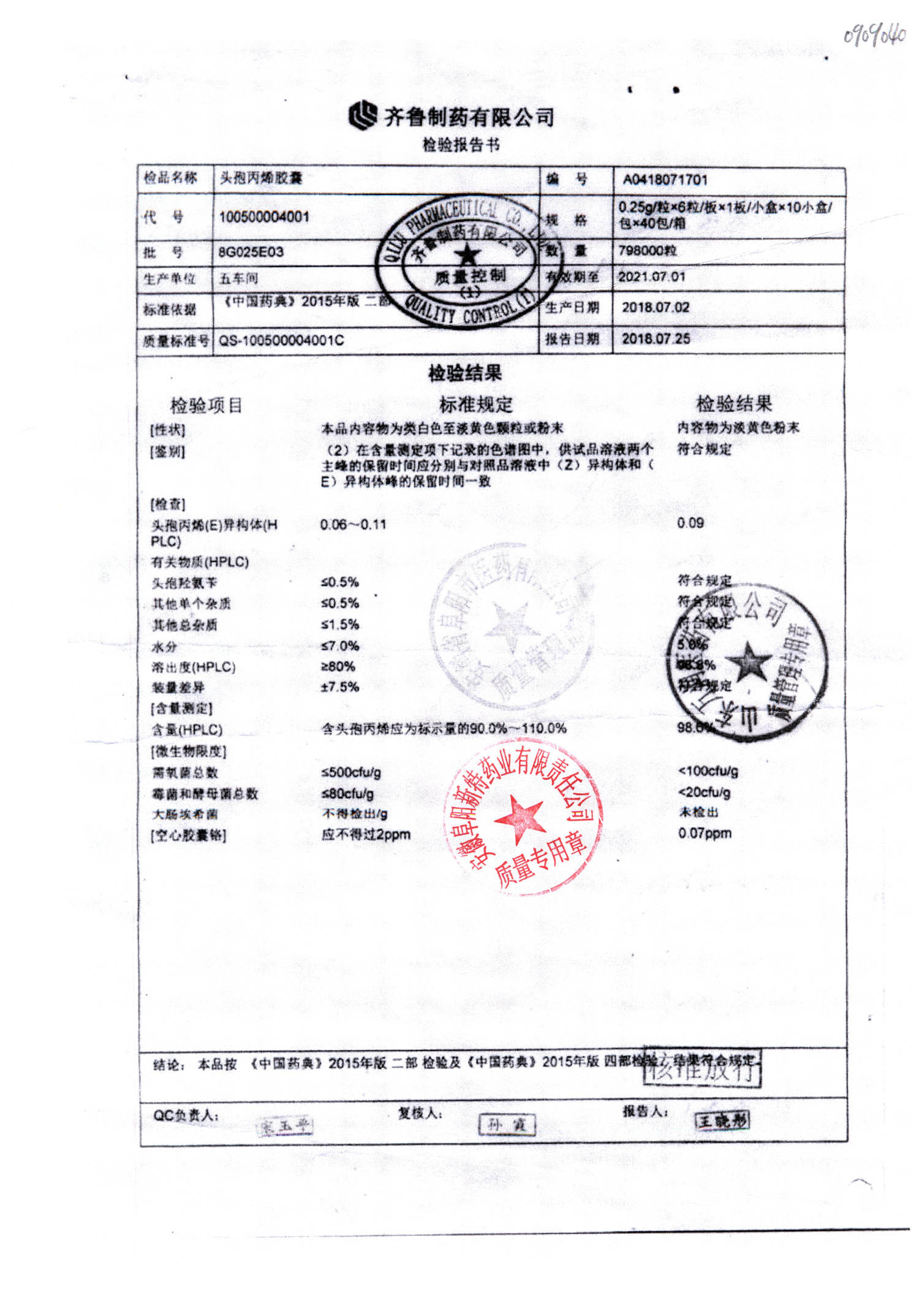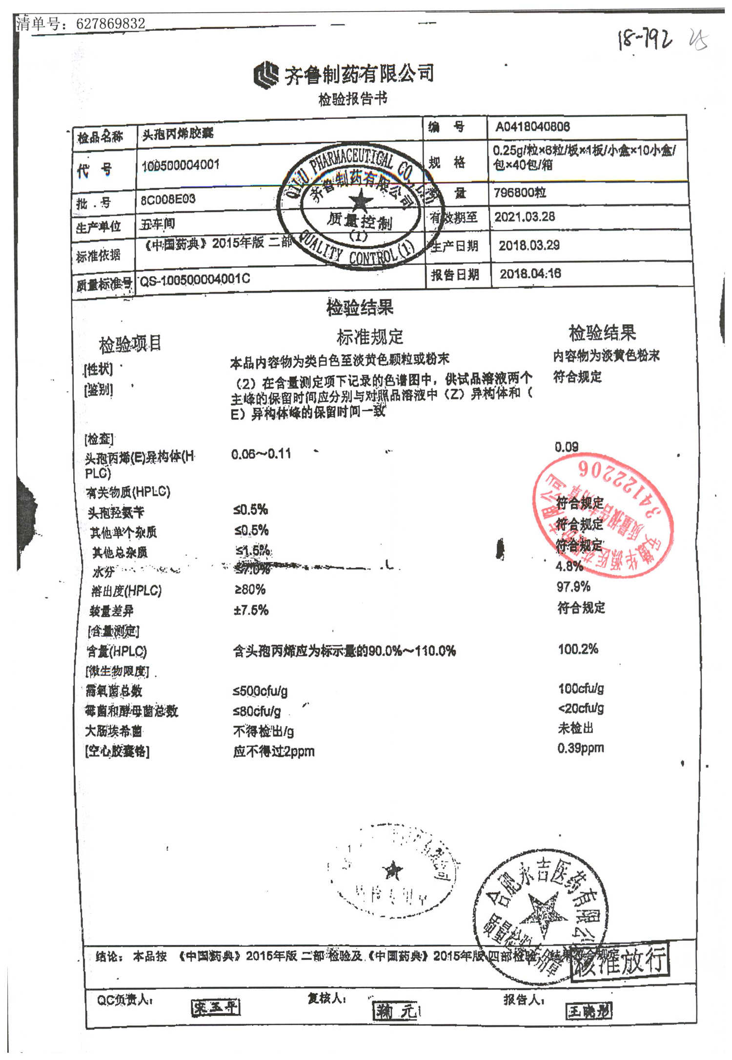 | 頭孢丙烯膠囊 | 0.25g*6s | 8J030E03 | 查看詳情 |