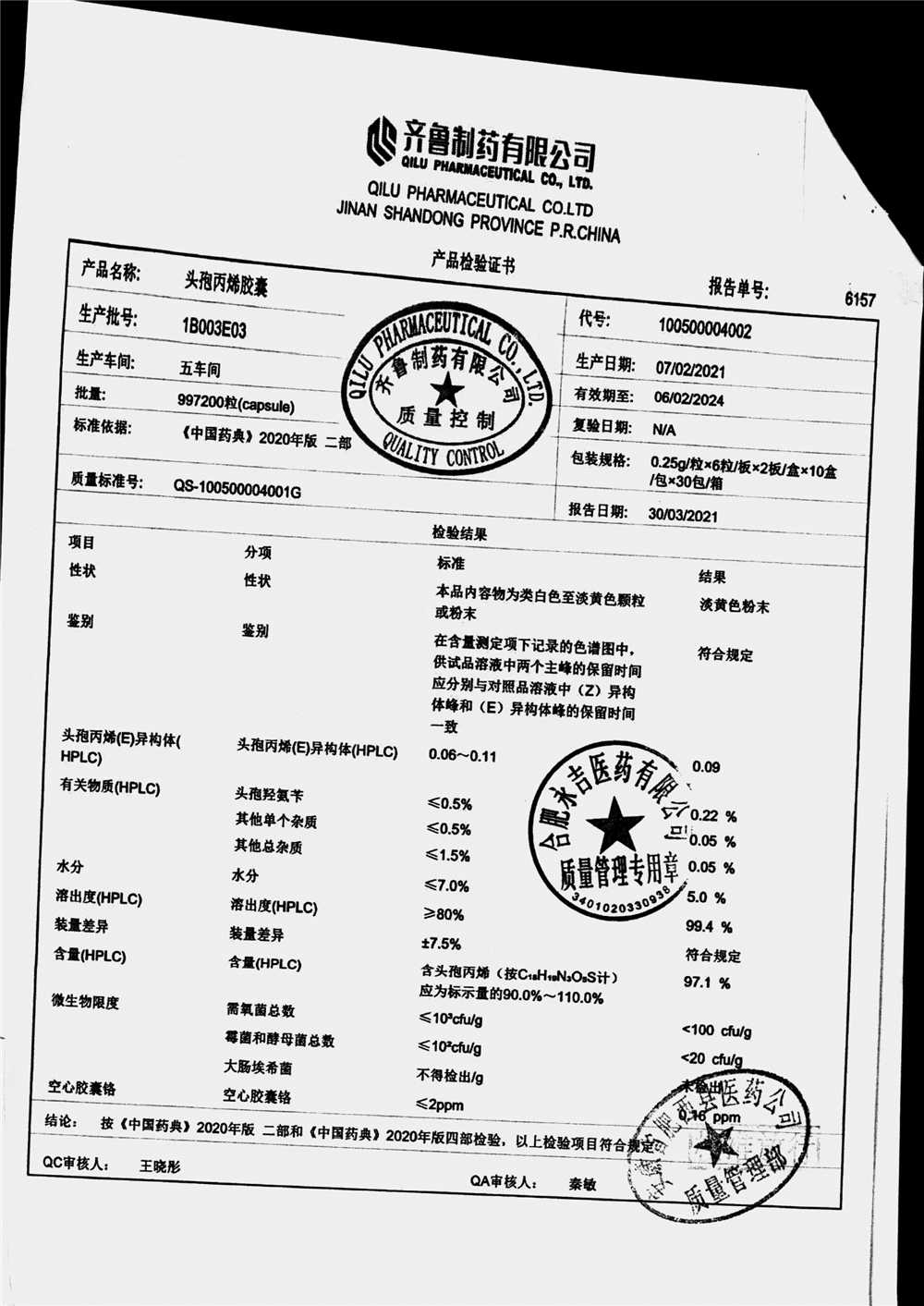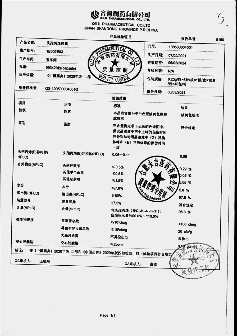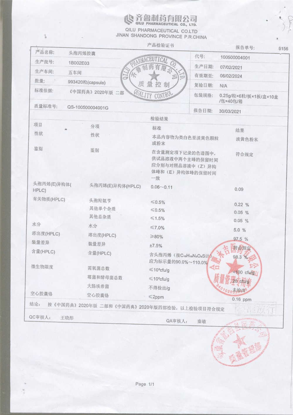 | 頭孢丙烯膠囊 | 0.25g*6s | 8J029E03 | 查看詳情 |